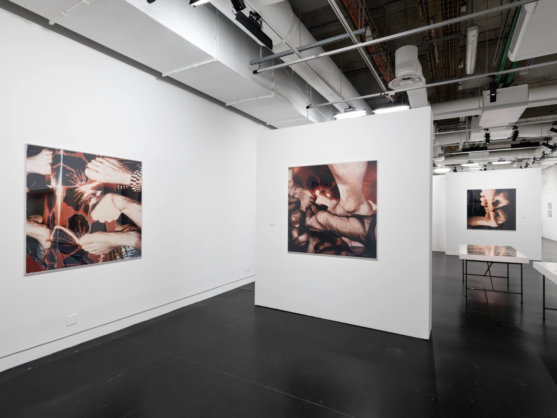 La spirale est encore présente dans ce cliché en plan serré d’un poing refermé sur lui-même. Il fait écho aux nombreuses images de fragments de corps qui parsèment l’espace d’exposition, à partir desquels Hannah Villiger réalise des assemblages poétiques, sortes de cadavre exquis abstraits. Ces blocs, ainsi qu’elle les appelait, sont construits à partir de Polaroïds qu’elle découpe et scotche entre eux pour faire naître des formes, proches de la sculpture. Lorsqu’elle n’utilise que des clichés uniques, imprimés en grand format, leur accrochage dans l’espace est pensé comme un assemblage, une manière pour elle de sculpter l’espace.