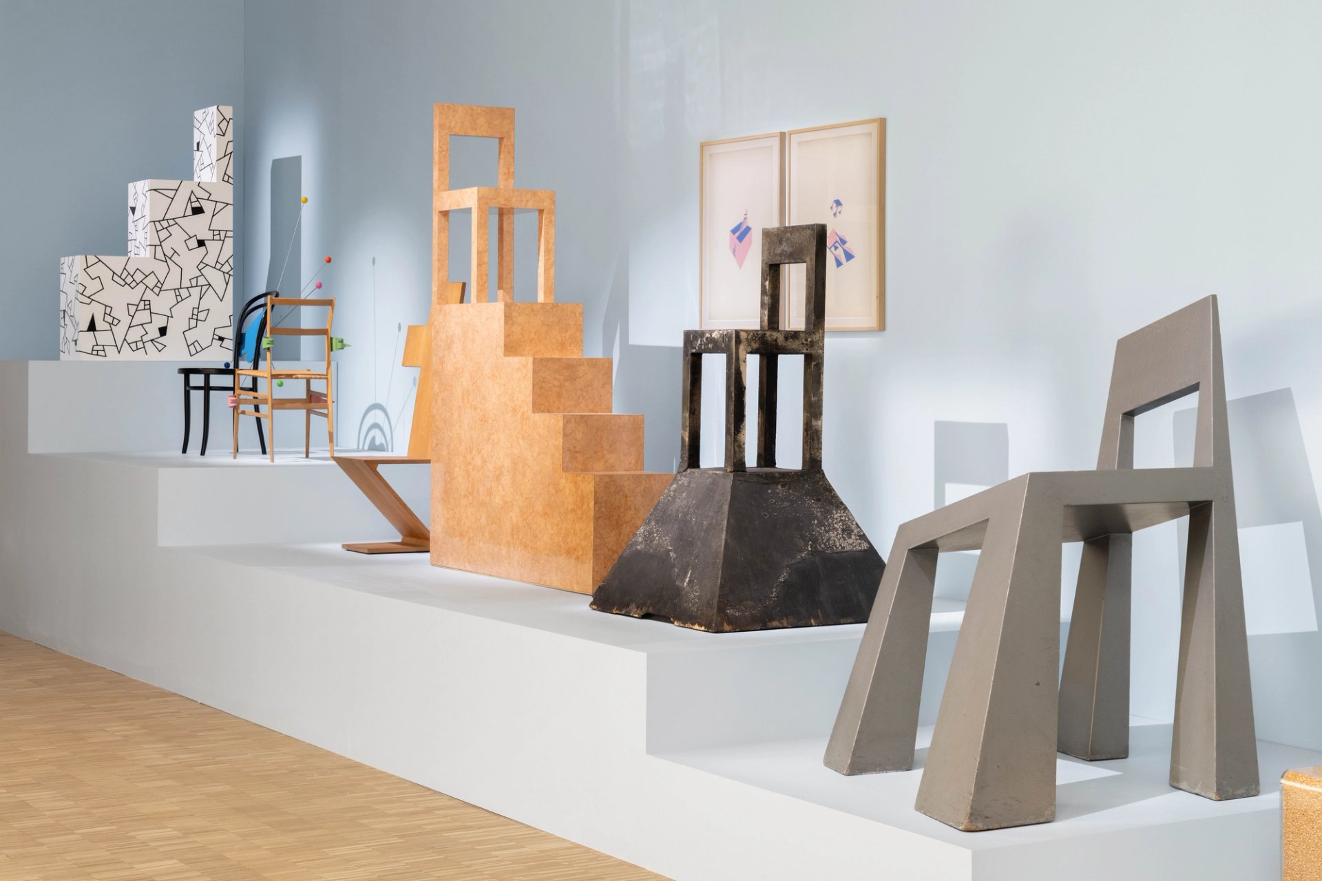 Sur une table et ses cimaises attenantes, sont présentés une multitude de projets d’architecture – plans, maquettes, photographies –, réalisés, telles cette aile du Groninger Museum et une station du métro de Naples, ou non. Côté mobilier : nombre de créations ne se révèlent pas uniquement fonctionnelles ou efficaces, mais drôles et inventives, mystérieuses ou ironiques, voire touchantes. Le buffet rouge Mania repose sur deux pieds plissés géants et ses portes sont truffées de signes cabalistiques. Une armoire Tre Primitivi affiche des formes archaïques, voire anthropomorphiques. D’aucunes pièces arborent une expression qui les rend immédiatement chaleureuses : « Un objet doit devenir un ami », disait Mendini.