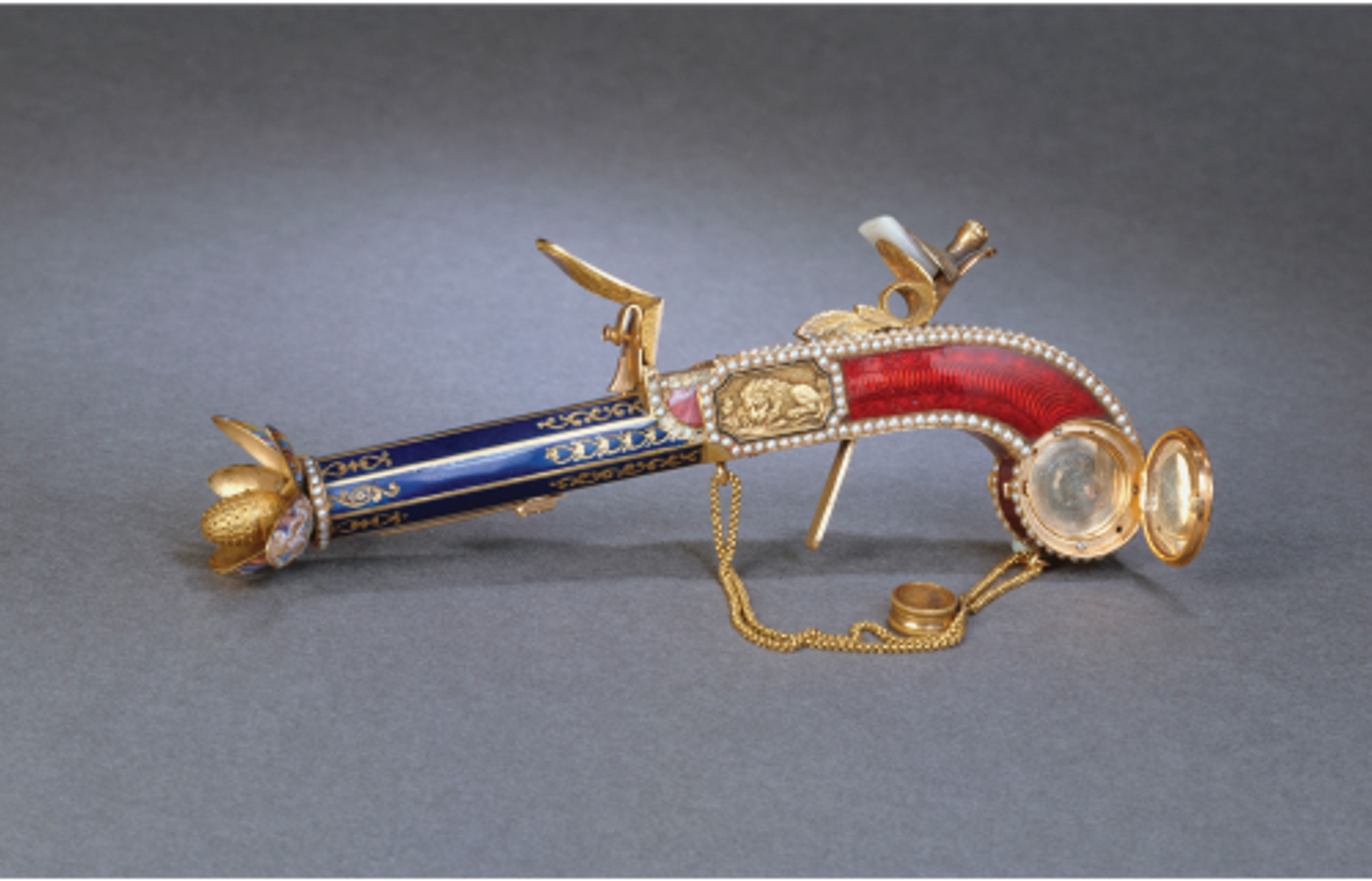 Jean-François Bautte, pistolet à parfum, vers 1800, or émaillé sur fond guilloché, or ciselé et perles. © CC0 Paris Musées/Musée Cognacq-Jay.