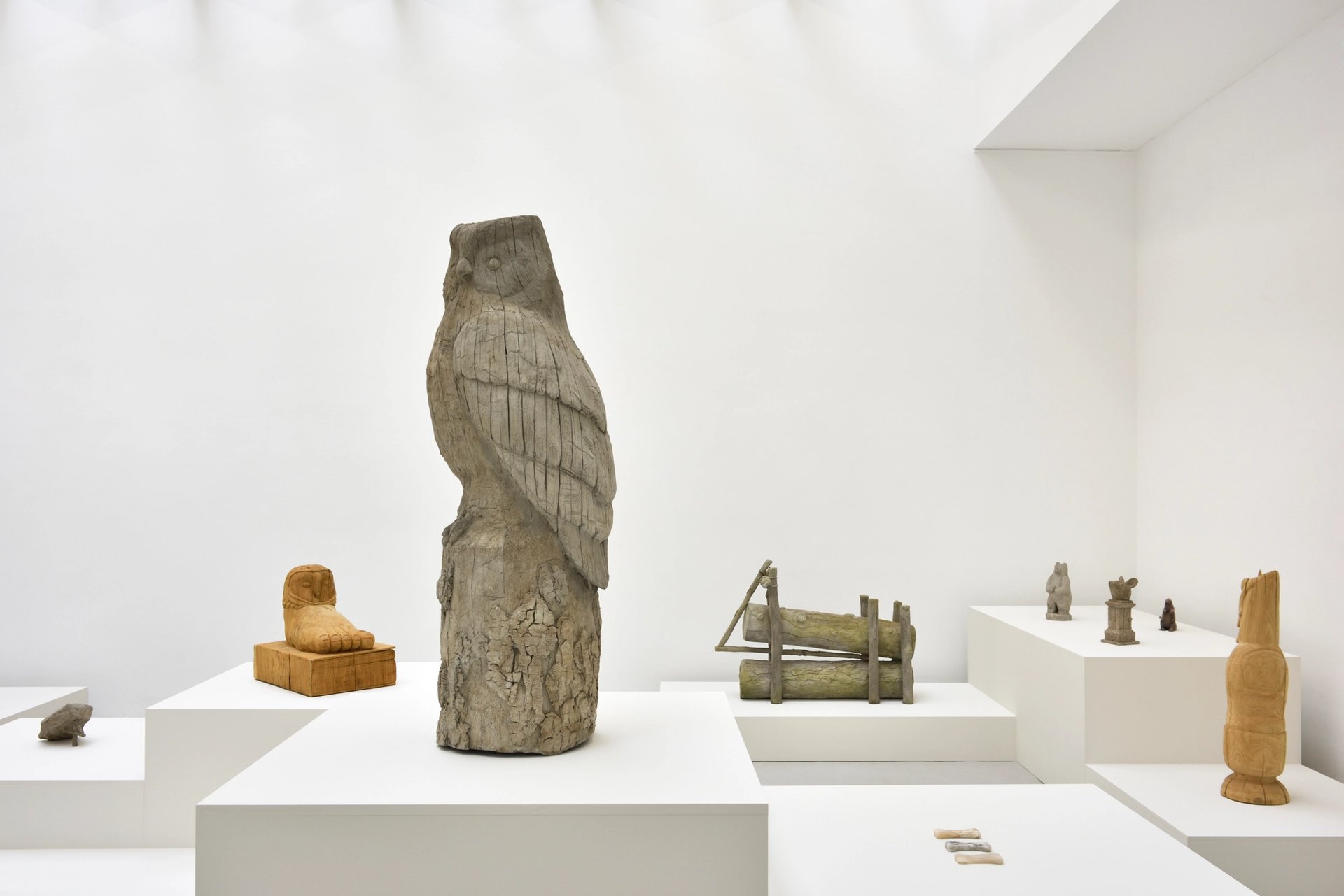Une massue herculéenne de 2,50 mètres dressée à la verticale, seule au milieu de la pièce, comme le symbole de la sculpture ; telle est la vision inaugurale dans l’exposition de Laurent Le Deunff. Elle est en ciment mais imite le bois, comme une grande partie des œuvres de l’exposition. Cette pièce avec sa base cylindrique, sorte de monument pour jardin de banlieue, ne laisse rien présager de ce qui nous attend dans la deuxième salle. Là, un large ensemble de sculptures, de moyennes et petites dimensions, sont exposées sur des podiums blancs comme une parodie de présentation muséale. Au son de l’eau que déverse une fontaine représentant un blaireau au-dessus d’un tronc d’arbre évidé, nous sommes confrontés à des animaux et des choses. Ces dernières, ce sont aussi bien des pièges de trappeurs en bûches que des os pour chien en marbre. Laurent Le Deunff brouille les distinctions entre objet ethnographique, art folklorique et grand art. Les sculptures en ciment portent le nom de ce qu’elles représentent tandis que les sculptures en bois ont pour titre l’essence dans lesquelles elles ont été créées. Ainsi, Chêne montre un pied humain surmonté d’une tête de chouette et posé sur un fort volume de bibliothèque, ou Buis un nez troué comme une flûte et surmontée d’une souris. Se glissent dans cette faune onirique des jeux formels et des considérations sur le rapport de la sculpture et du socle.