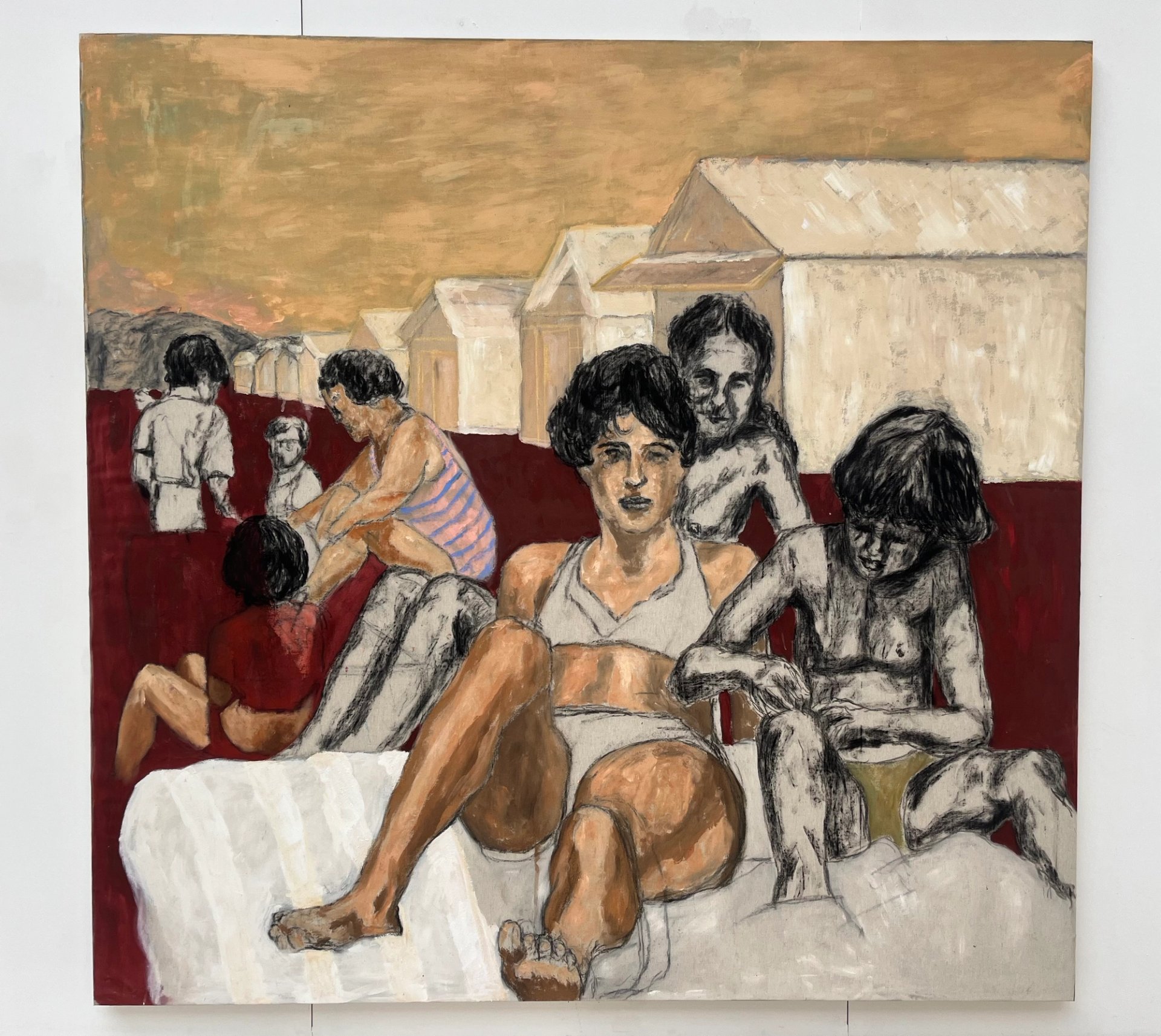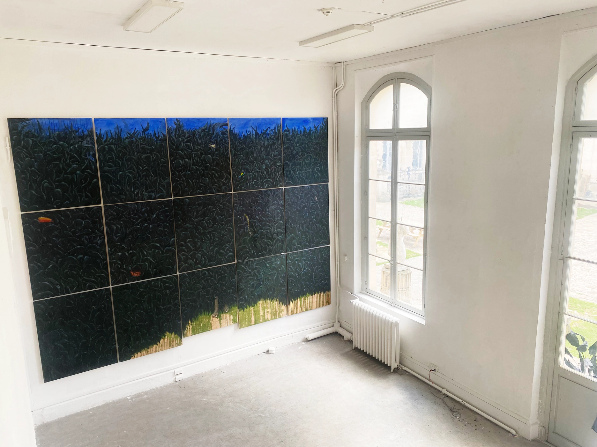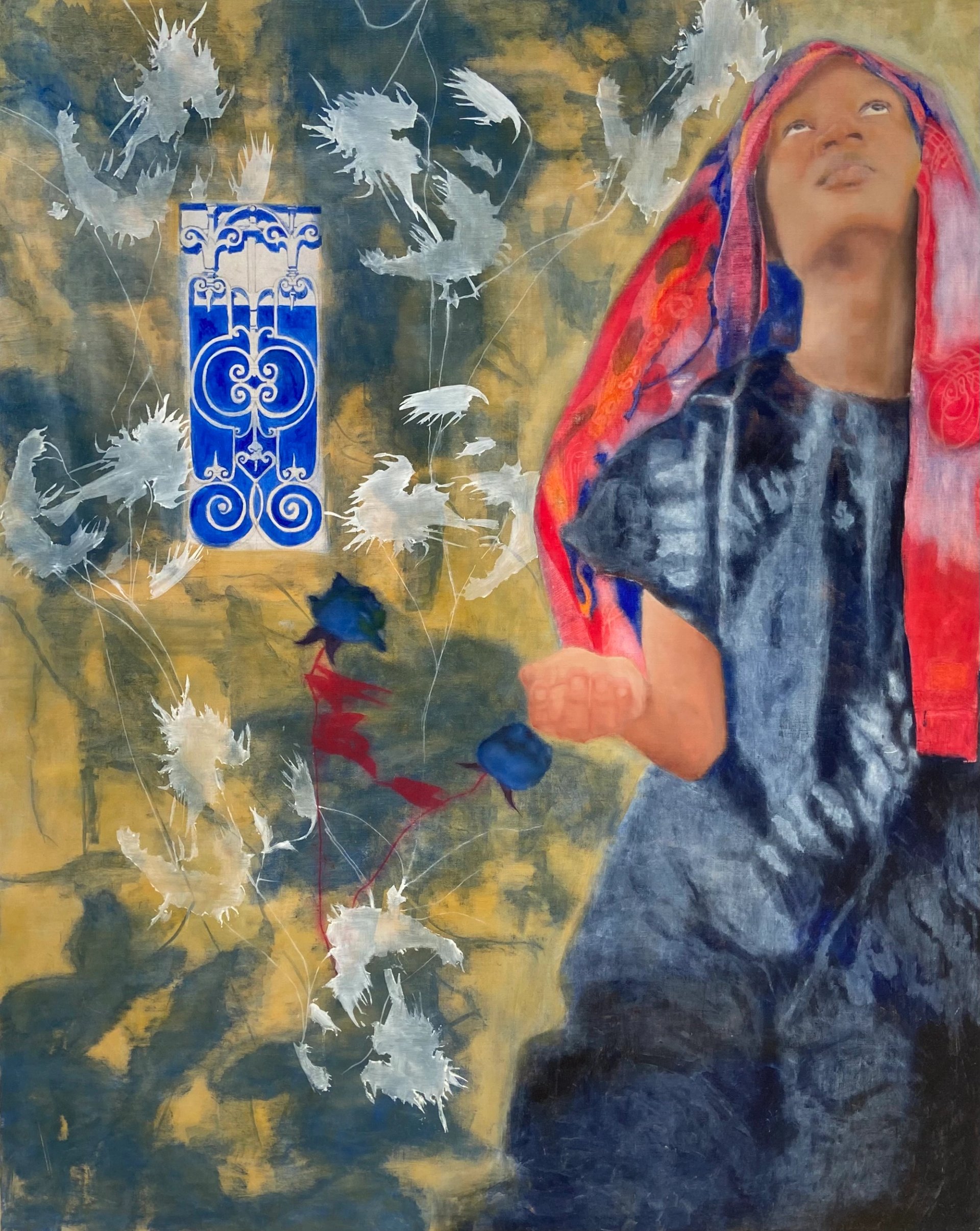 Maria Adjovi est lauréate du prix Weil. Elle est en 3e année dans l’atelier Eitel et « base son travail sur une construction narrative nourrie par des histoires intimes, des textes et des rencontres qui se connectent à elle. Elle se laisse aussi guider par la morale de vie, presque comme un fardeau de l’existence humaine ». La peintre emprunte aux codes religieux pour écrire son propre langage pictural. Maria Adjovi procède par « effacement-recommencement, jusqu’à ce que cela reste ».