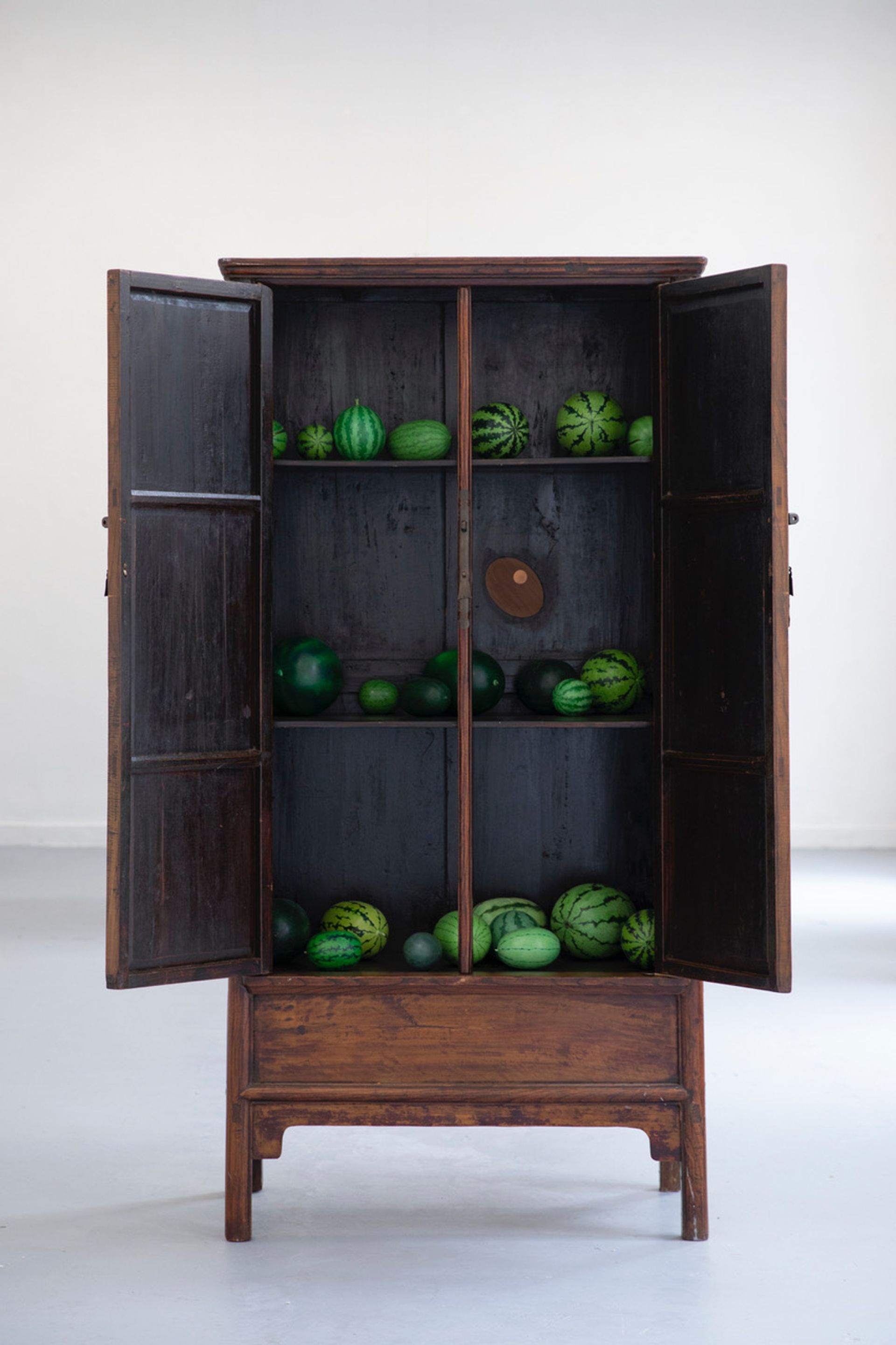 Libo Wei, Pure goodness (watermelon) v.01, pastèques en bois (peinture acrylique et peinture à l’huile), meuble récupéré, bois incrusté, 100 x 60 x 200 cm, 2024. © Libo Wei