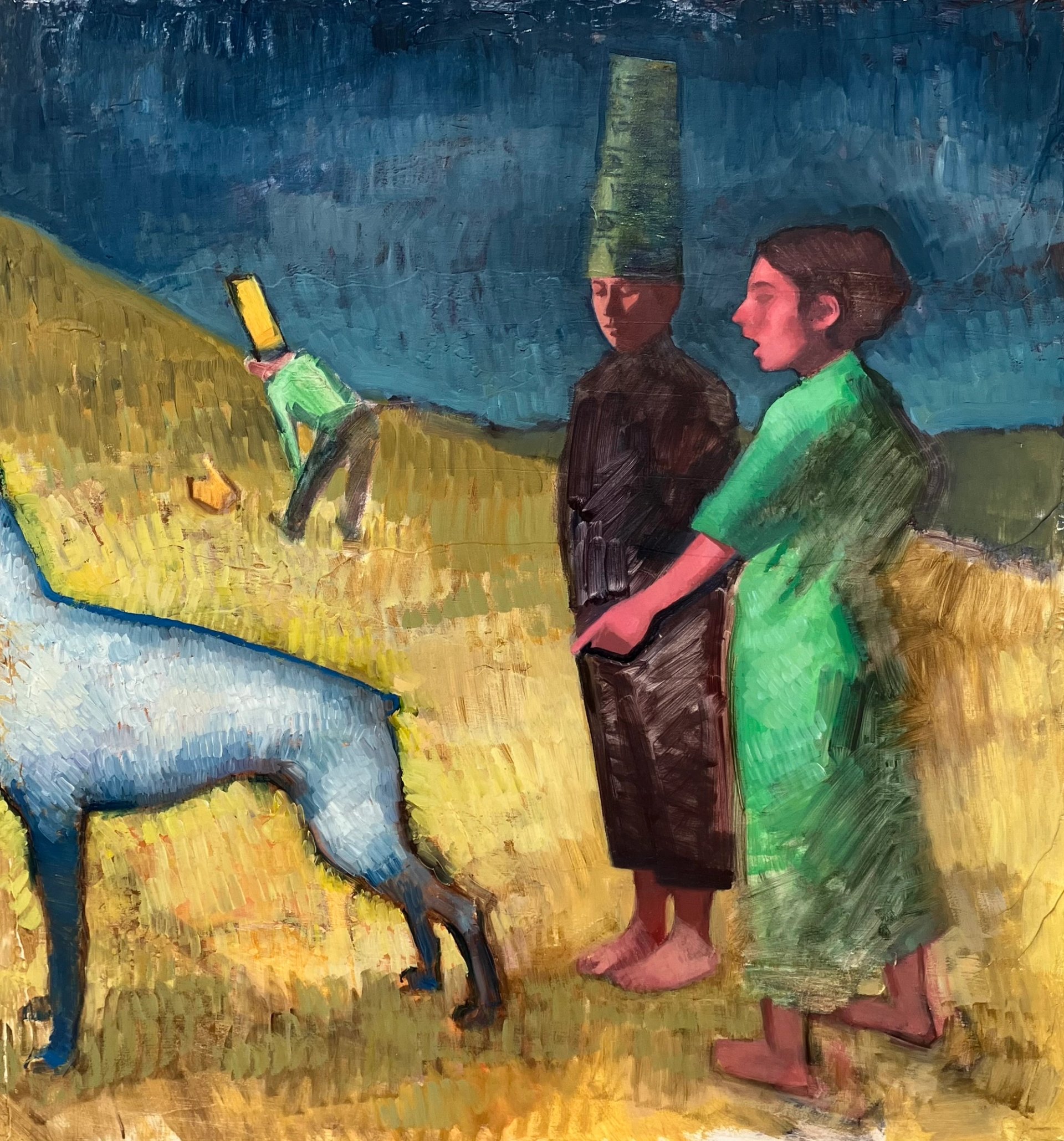 Timothée Gruel, Propriétaires inspectant le chien, 2023, huile sur bois, 50 x 50 cm. © Timothée Gruel
