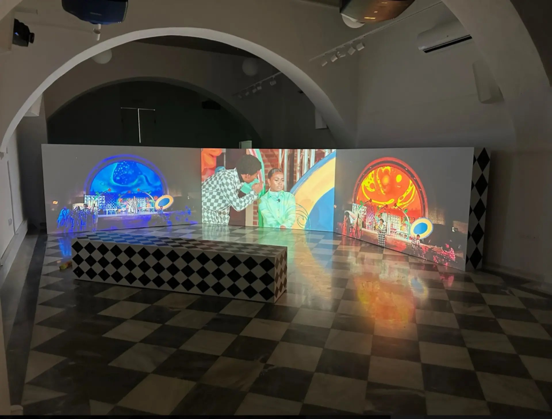 Cette vidéo sur trois écrans (présentée jusqu’au 2 juillet) revisite, plutôt qu’elle ne documente, Sounding Board, la pièce de théâtre musicale (avec une bande-son signée de Boney M) à laquelle elle a contribué à la Biennale Performa en 2021. Tschabalala Self a écrit, mis en scène et peint les décors. Elle a également conçu les costumes de ce drame tourbillonnant sur les dilemmes moraux, sexuels et sociaux de couples romantiques, et a confié à deux acteurs deux rôles chacun, en y ajoutant un chœur grec de chanteuses.