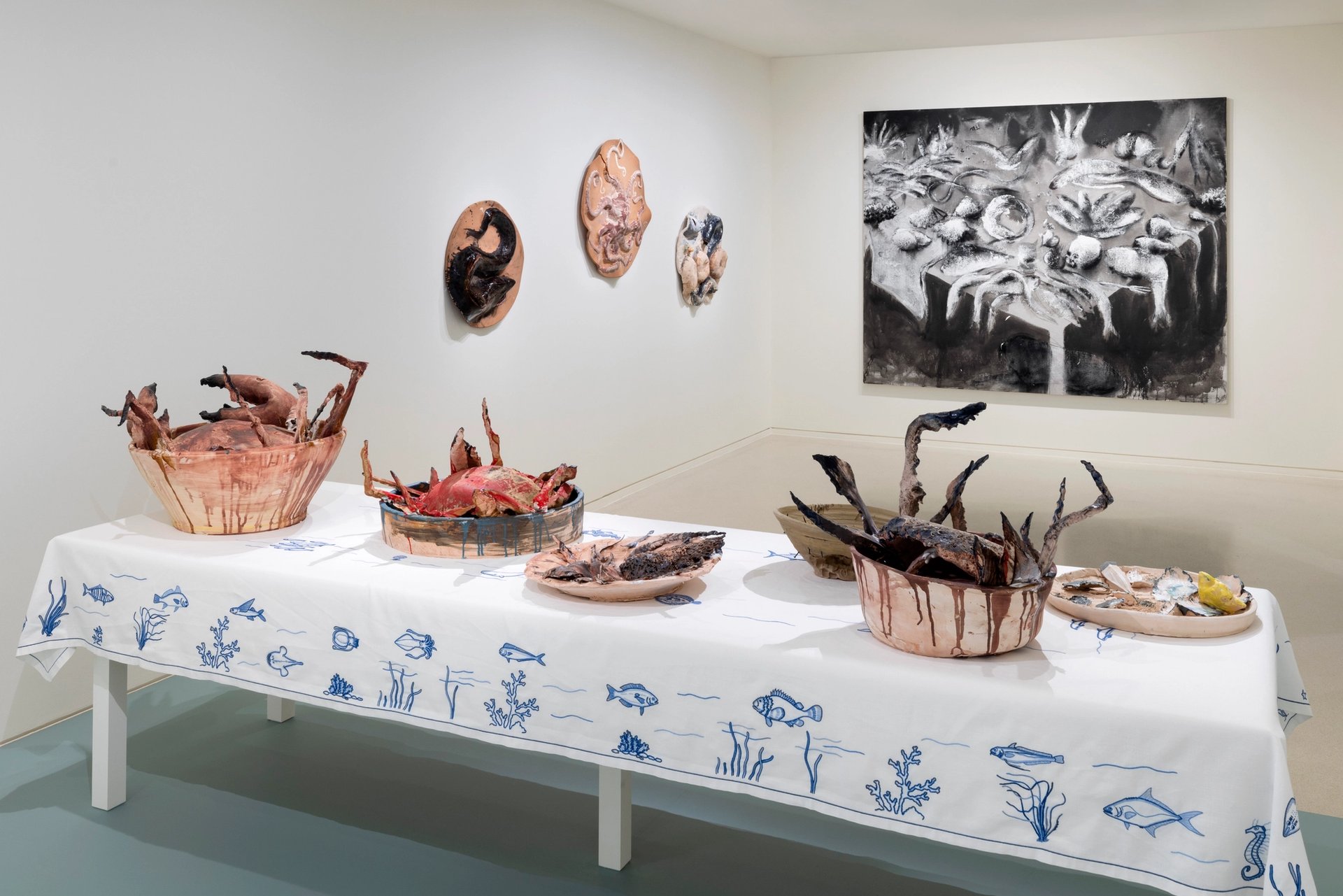 Immergé dans l’obscurité abyssale, l’œil reconnaît plus loin une nature sous-marine pleine de magnificence, corail, mais aussi poulpe dont la substance phosphorescente et mouvante s’avère sans cesse en voie de reconfiguration. Cette approche thématique se poursuit et plus haut, prise entre ciel et eau, les représentations picturales de la mer en tempête s’accordent avec le tumulte cosmique, laissant alors transparaître l’espace infini des flots. Le prisme maritime laisse ainsi libre cours à toute la cartographie de l’œuvre de Miquel Barceló, constellée de pratiques et de références éclectiques. Aux côtés de ses grandes toiles, figure également sa production de céramiques – poissons, festins de fruits de mer — débutée lorsque l’artiste vivait au Mali au début des années 1990 et laquelle fait écho à la tradition du bodegón toute comme à la culture antique des grandes thalassocraties méditerranéennes. Des carnets de voyage parsemés d’aquarelles, un bronze mais aussi, plus surprenant, des broderies, exécutées par la mère de l’artiste à partir des dessins de ce dernier, complètent cette magistrale exposition où l’odyssée du vivant laisse divaguer le regard en toute liberté.