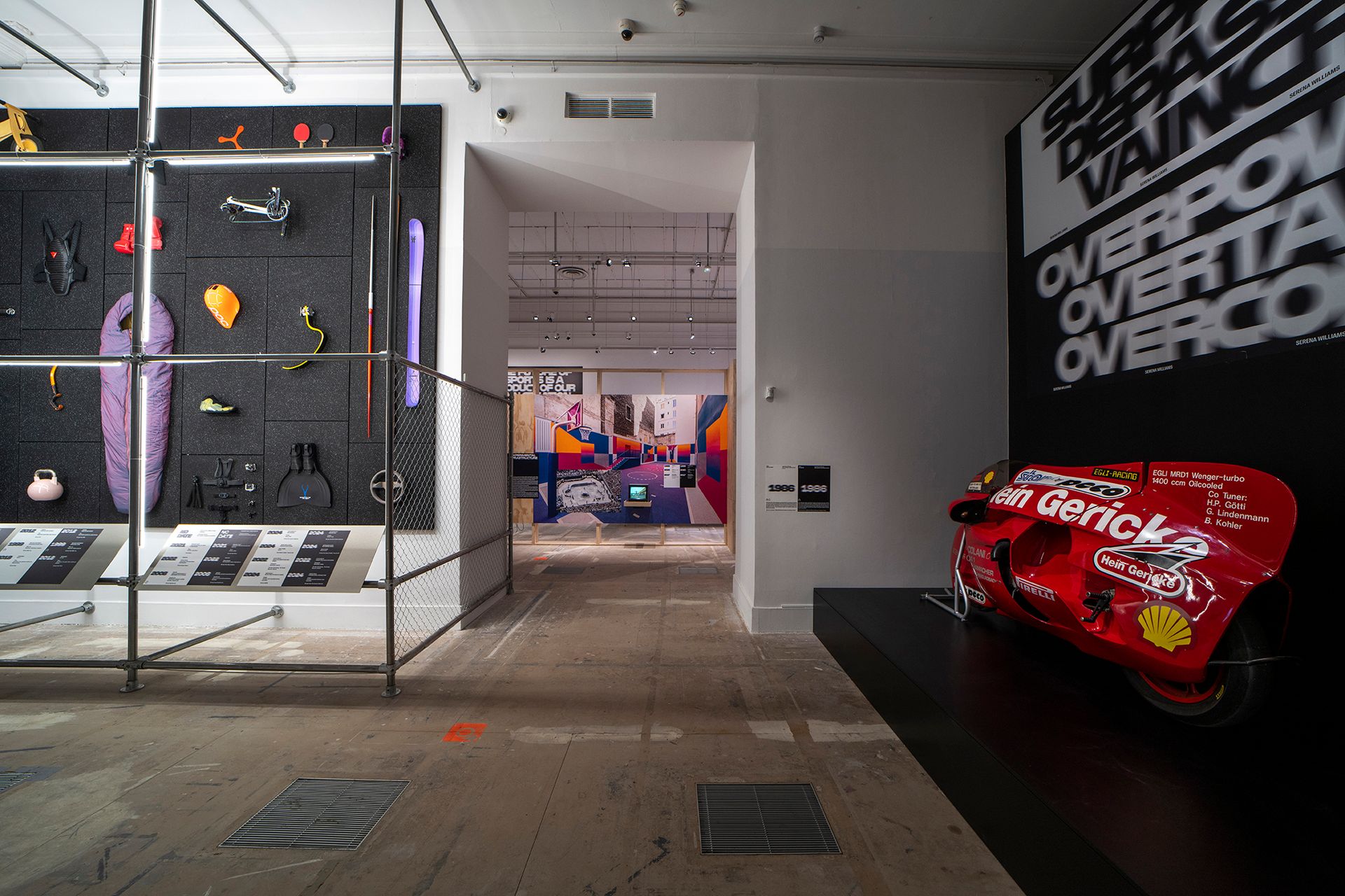 Améliorer ses capacités est évidemment l’objectif majeur de l’athlète. Une cimaise truffée d’équipements l’évoque, depuis une chaussure de ski du designer Roger Tallon pour Salomon (1979) jusqu’à ce prototype de raquette de tennis imprimé en aluminium 3D (studio All Design Lab, 2022). En 1986, le designer allemand Luigi Colani, lui, était un précurseur lorsqu’il « sculptait » cette moto aérodynamique à l’allure organique Egli-Kawasaki, où l’homme et la machine ne font qu’un, et qui battit le record du monde de vitesse sur 10 km départ arrêté.