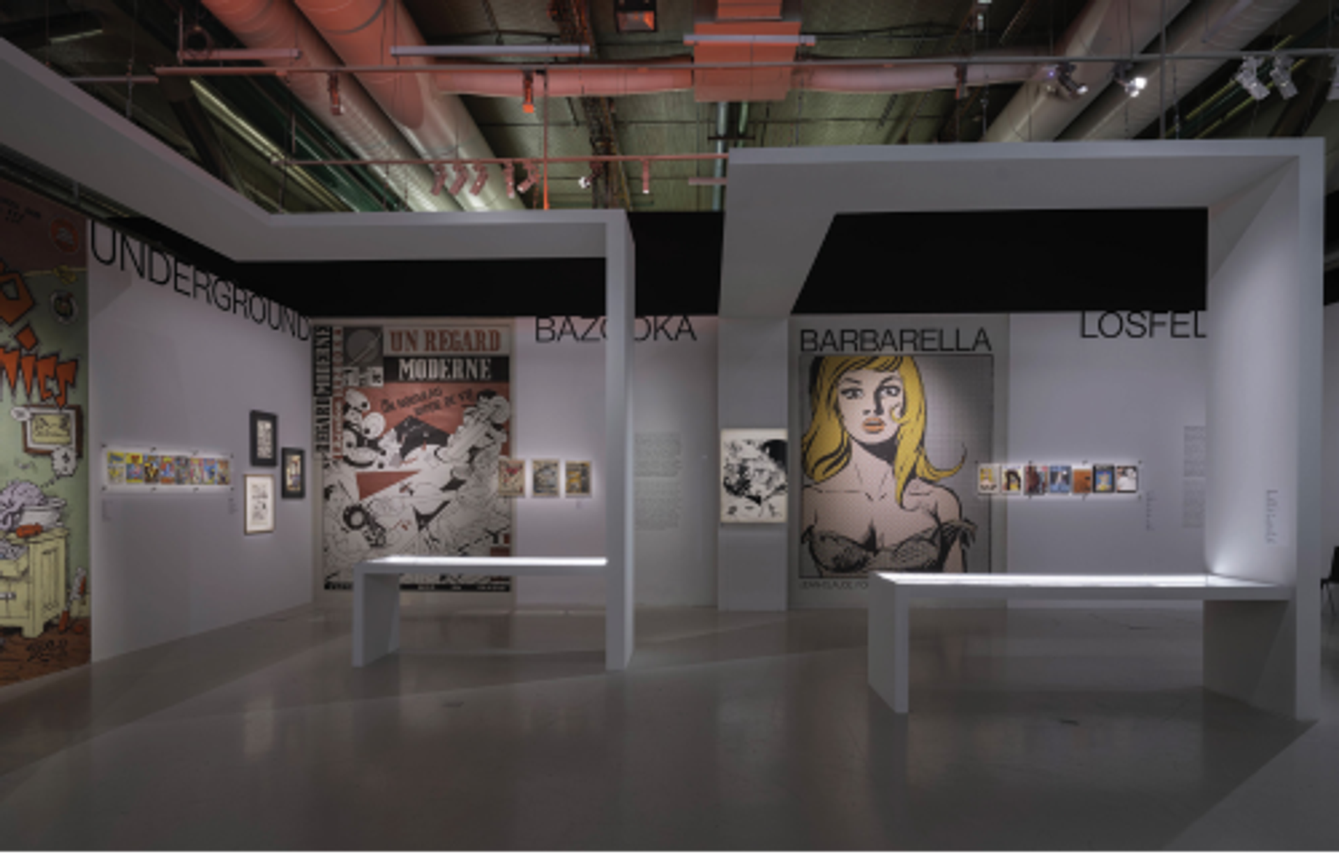Ce mitan des années1960 marque également l’avènement de la contre-culture, et, en matière de bande dessinée, les principales initiatives éditoriales à travers la planète concernent la création européenne, le manga asiatique et les comics américains. En 1964, par exemple, est lancé, au Japon, le mensuel d’avant-garde Garo – qui déplie le concept de bande dessinée d’auteurs. À Paris, l’éditeur Éric Losfeld fait paraître, en un opus luxueux, Barbarella de Jean-Claude Forest, l’une des premières BD pour adultes. Aux États-Unis, la revue Zap Comix fédère le mouvement underground, aux côtés notamment de Robert Crumb ou Gilbert Shelton, et mêle provocation, obscénité et grotesque. De même en France avec le magazine « bête et méchant », Hara-Kiri – une série des premières couvertures entièrement dessinées par Fred est visible dans l’exposition –, dont la causticité jongle avec la censure et offre à l’humour graphique de nouveaux territoires.