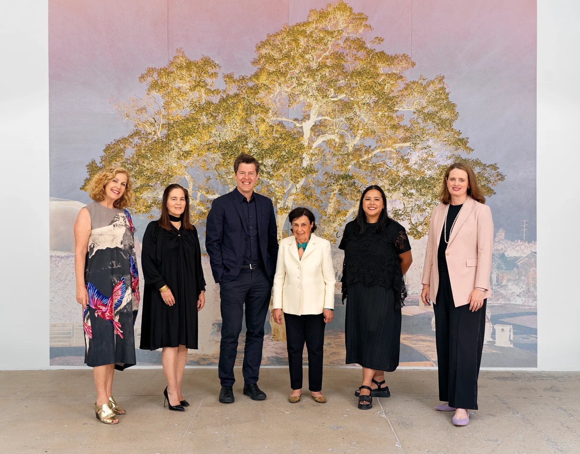 L'équipe de direction de la galerie Marian Goodman, de gauche à droite : Rose Lord, directrice associée, Leslie Nolen, associée, Philipp Kaiser, président et associé, Marian Goodman, directrice générale et fondatrice, Junette Teng, associée, et Emily-Jane Kirwan, directrice associée. Photo : Alex Yudzon, courtesy Marian Goodman Gallery