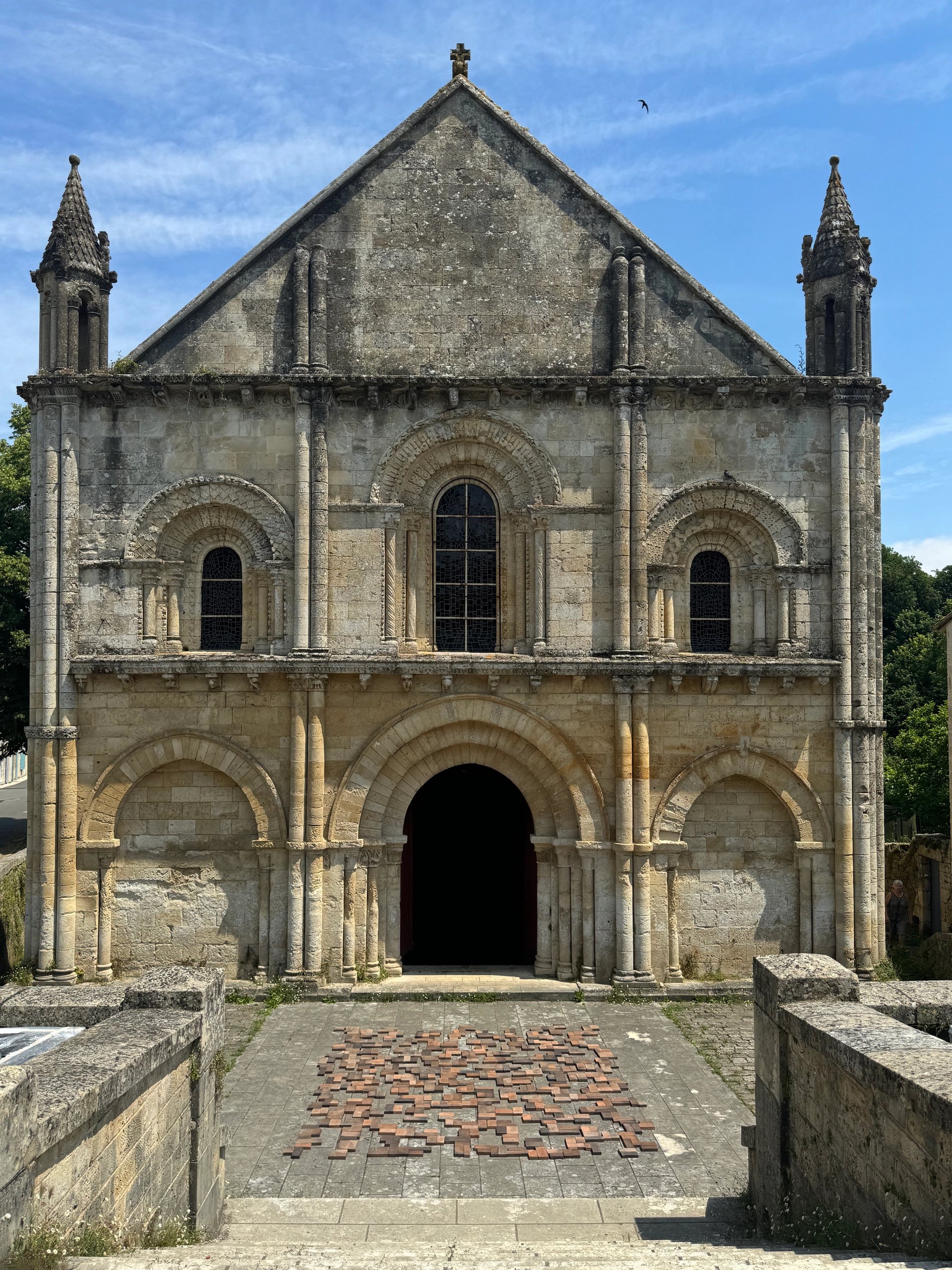 Katinka Bock, Horizontal Alphabet (black), 2016, dallage de briques en grès, dimensions variables, parvis de l’église Saint-Hilaire pour la Biennale de Melle 2024. © Katinka Bock, Cnap. Photo : Olivier Gaulon