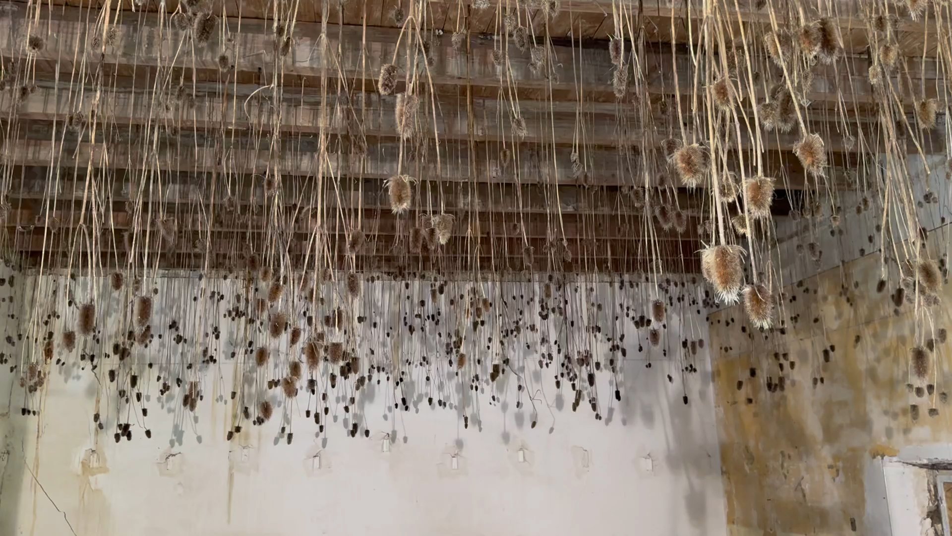 Jan Kopp, Après avoir retourné le champ, 2019-2024, installation de plusieurs centaines de chardons, dimensions variables, Salle Jeanne d’Arc pour la Biennale de Melle 2024. © Jan Kopp, Adagp Paris 2024. Photo : Olivier Gaulon