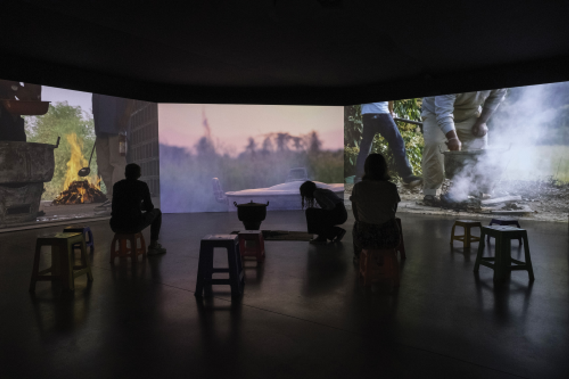 Vue de l’exposition « Rirkrit Tiravanija : A Lot of people », avec Untitled 2014-2016 (curry for the soul of the forgotten) (two), installation (bronze et vidéo HD à 3 canaux), Les Forges, parc des Ateliers, LUMA Arles, 2024. Courtesy Victor et Simon. Photo Iris Millot.