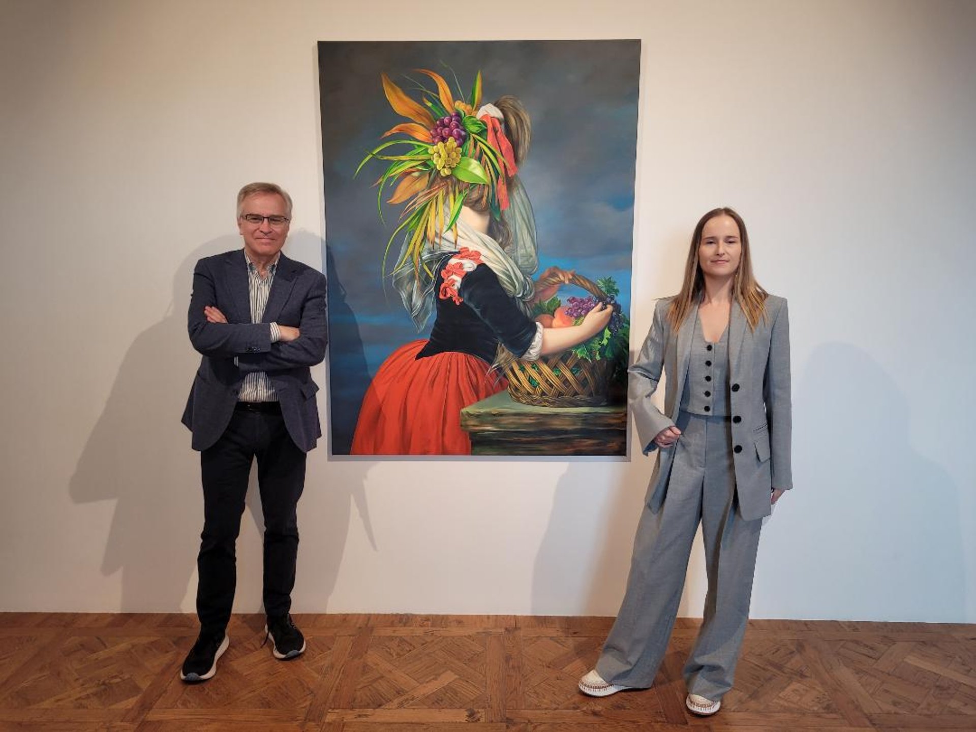 Représentée depuis 2019 par la galerie Almine Rech, l’artiste « a travaillé en pensant à Marie-Antoinette, qui déjà mettait des fleurs dans sa coiffure », souligne le commissaire de l’exposition, Guillermo Solana. Elle combine ainsi deux genres classiques un peu figés et distincts, la nature morte et le portrait, auxquels elle insuffle une nouvelle vie, un nouveau regard… Un zeste d’humour surréaliste n’est par ailleurs pas absent des toiles, servies par une technique à l’huile impeccable.