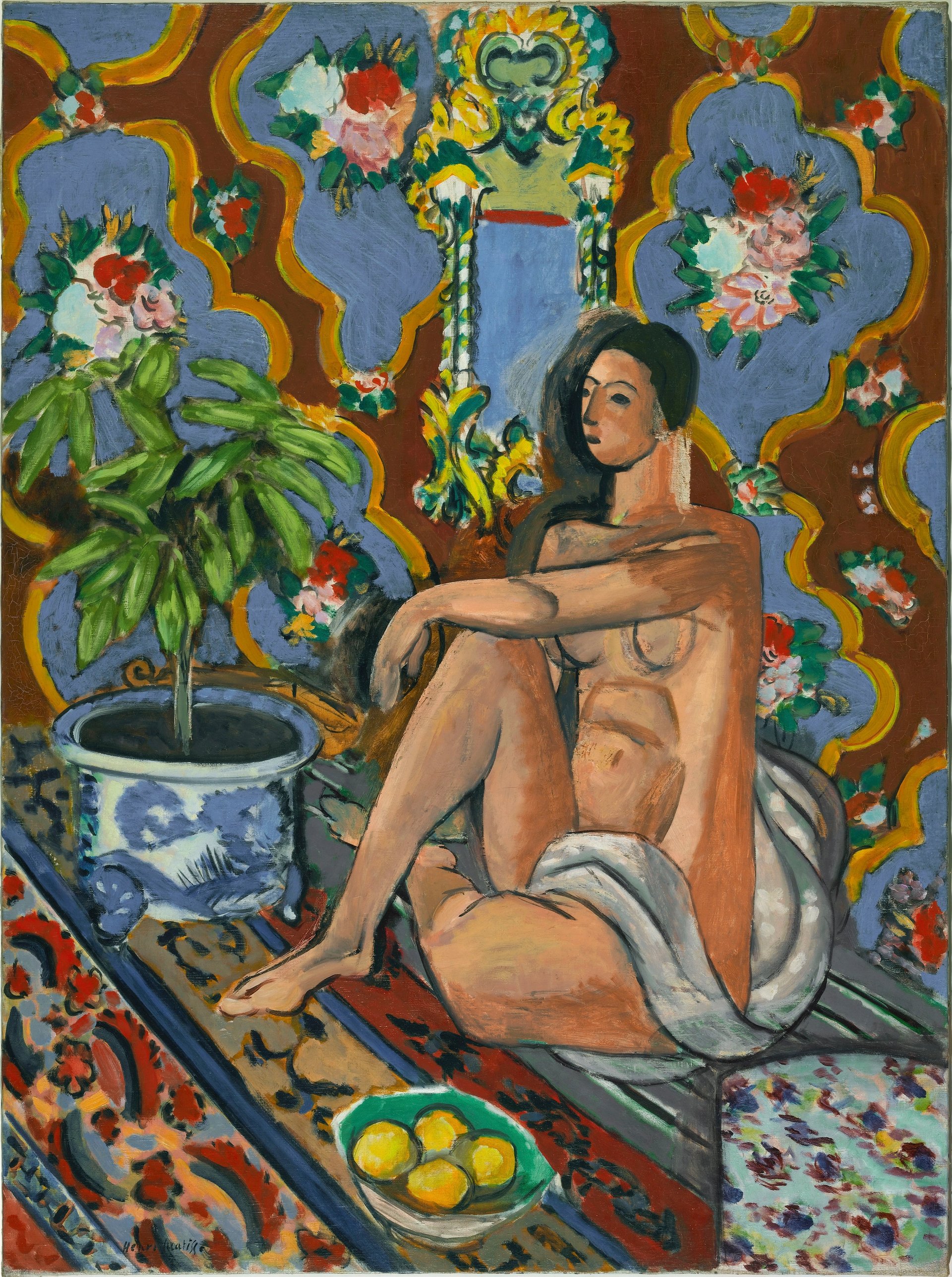Henri Matisse, Figure décorative sur fond ornemental, hiver 1925-1926, huile sur toile, Centre Pompidou, Paris - Musée national d’art moderne/Centre de création industrielle. © Crédit photographique : Philippe Migeat – Centre Pompidou, MNAM-CCI/Dist. RMN-GP. © Succession Henri Matisse