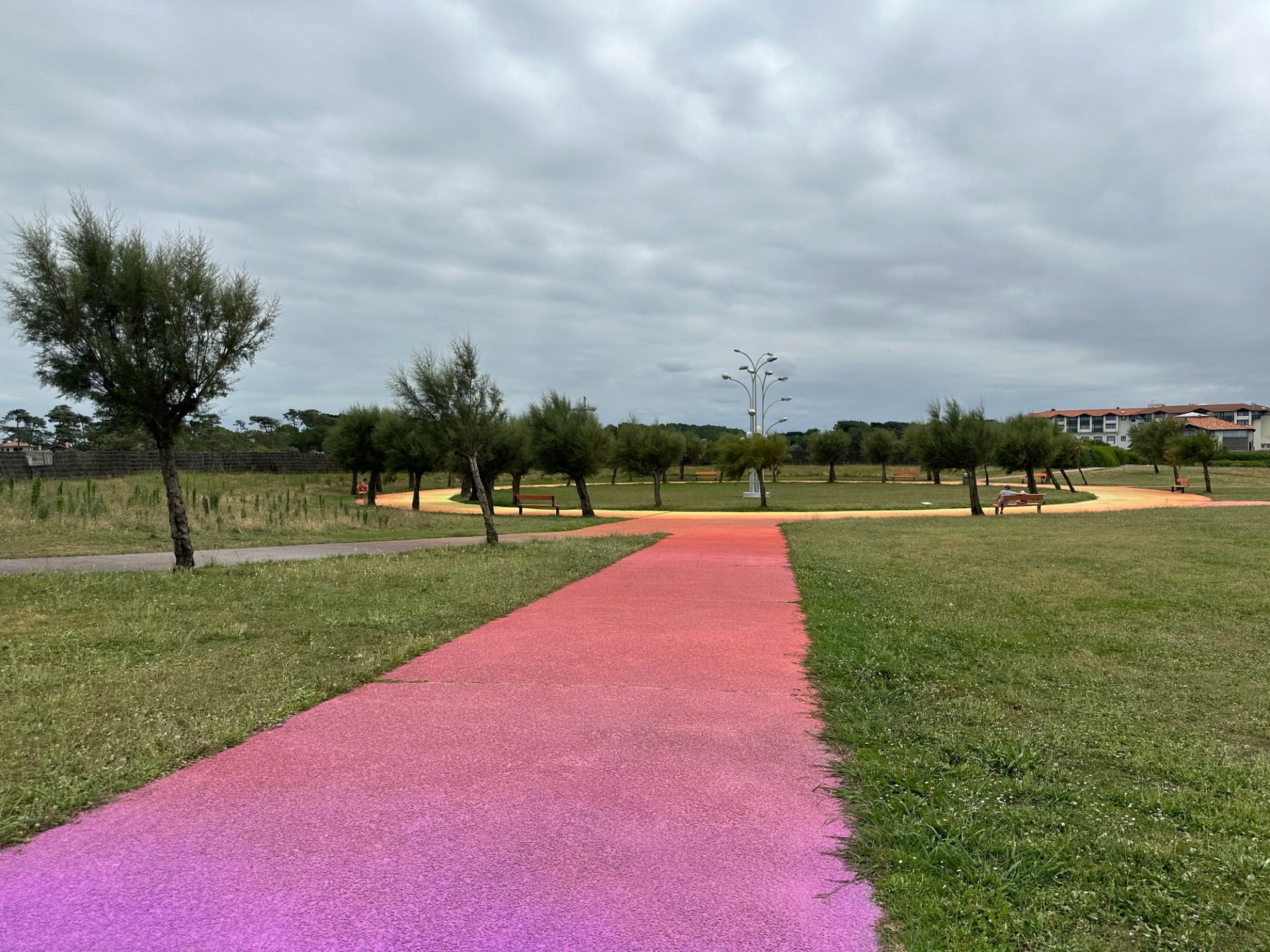 Le changement d’horizon est total sur le dernier site de la Biennale d’Anglet, à La Barre. Sur le bord de l’Adour, Kevin Rouillard a disposé 80 sculptures réalisées à partir de 1 000 bidons, qui deviennent sur les 160 mètres de cette esplanade comme autant de touches de couleur impressionnistes. Plus loin, Jennifer Caubet a aménagé une Agora délimitée de façon subtile par des drapeaux portés par des mâts et deux bancs aux dimensions inhabituelles, puisqu’ils s’étendent sur six mètres. Si MBL architectes propose un crib aux dimensions industrielles un peu décalé, Flora Moscovici offre une dernière couche colorée à la biennale en recouvrant le chemin entourant et menant au Bouquet de Mathieu Mercier, installé ici en 2013, d’un dégradé de couleurs chaudes rappelant le coucher du soleil. Éclatant !