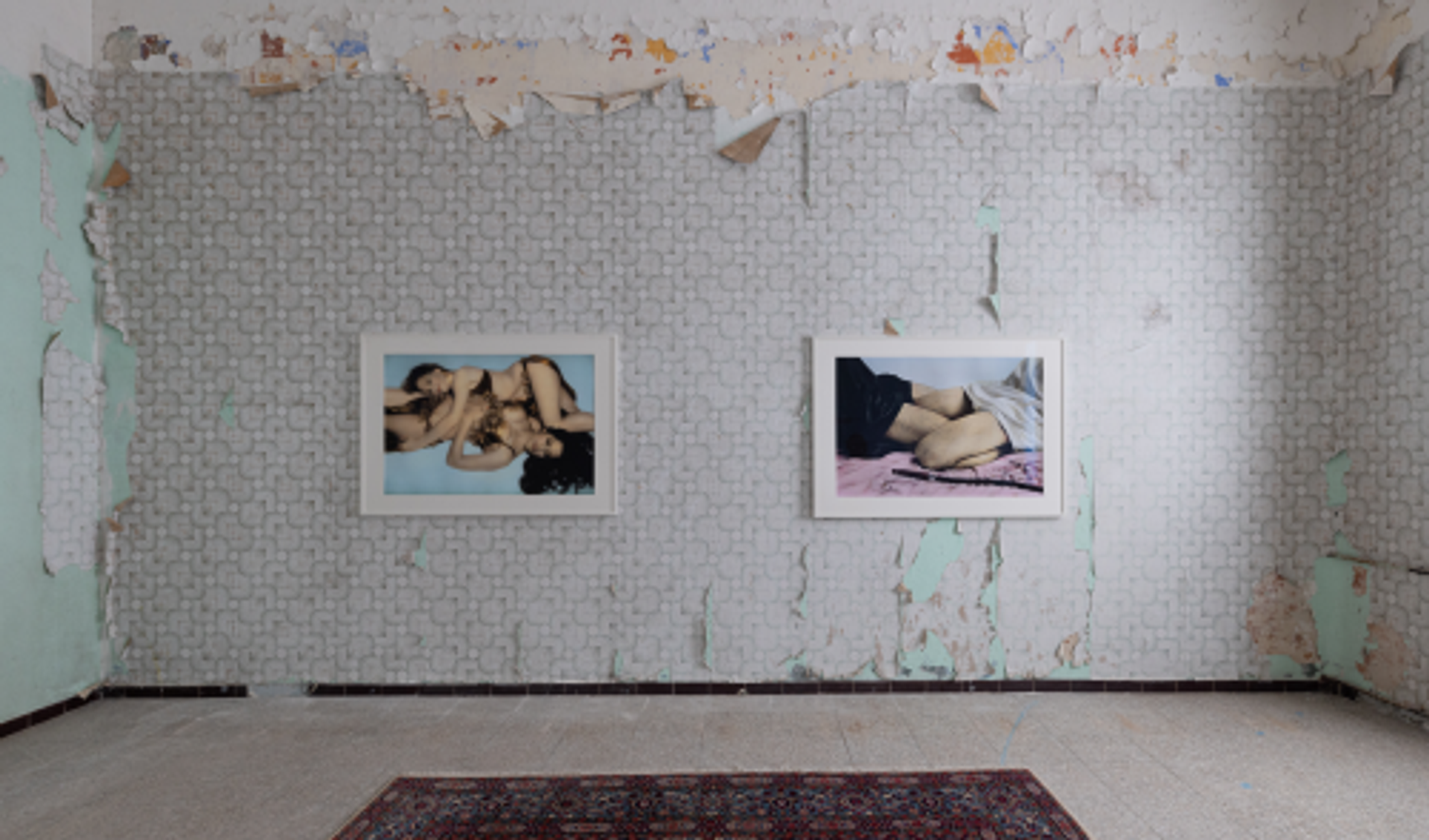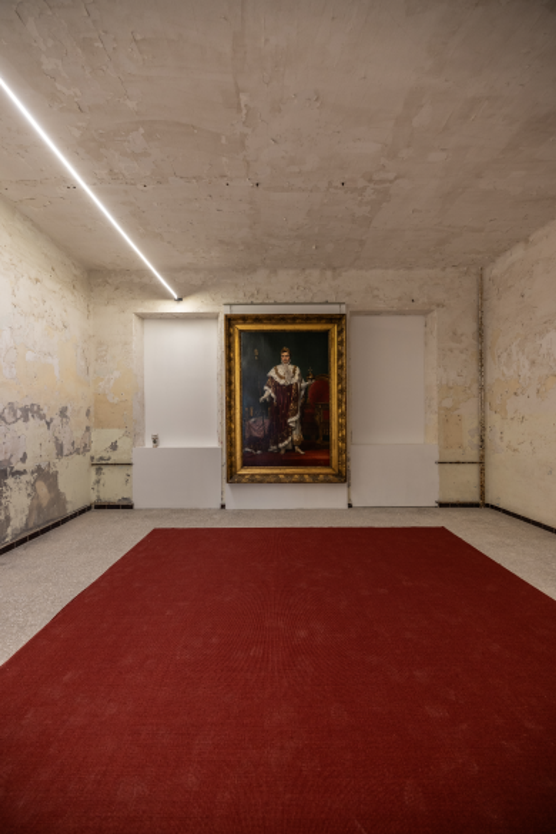 Son portrait ouvre le premier parcours consacré à la perception d’une chute venue « de l’intérieur », où la décadence mène à un état de ruine, favorable à la renaissance. Peint par Jacques-Louis David et prêté par le musée Fesch, à Ajaccio, Napoléon Ier en costume de sacre (1805) introduit cette déambulation au sein de la caserne Montlaur, où le passé méditerranéen éclaire le monde contemporain. Il en va ainsi de The Feast of Trimalchio (2010), monumentale fresque vidéo du collectif russe AES+F, dont la narration s’inspire du célèbre Satyricon de Pétrone, revisité dans un étonnant mélange de références historiques et d’iconographie contemporaine, et dépeignant les grandes questions géopolitiques et raciales actuelles. Pour preuve, un bronze de Kehinde Wiley représente deux jeunes hommes noirs, guerriers tombés dans une bataille des temps modernes, emblématiques d’une génération opprimée. Le sceau du passé est vivant et visible, dans un cadre architectural brut aux murs effrités et papiers peints déchirés. Réminiscences des visions babyloniennes, dans leur abondance de couleurs, de richesses et de plaisir, les œuvres du photographe égyptien Youssef Nabil rejouent constamment les codes propres à l’imaginaire orientaliste. Avec Natacha fume le narguilé (2000) ou Deux Djellabas (2007), l’image photographique, colorisée à la main, se voit conférer un charme doux et suranné, lequel rend hommage à l’âge d’or du cinéma égyptien.