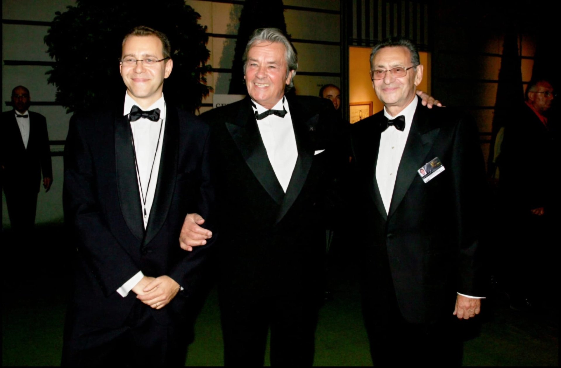 Alain Delon, du temps de la splendeur de la Biennale des Antiquaires, avec à sa droite le marchand Franck Prazan et son père, Bernard Prazan. Photo Bertrand Rindoff Petroff. Courtesy Galerie Applicat-Prazan
