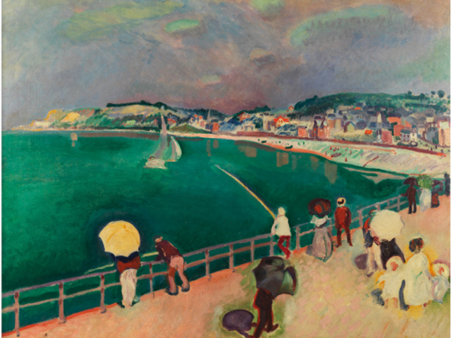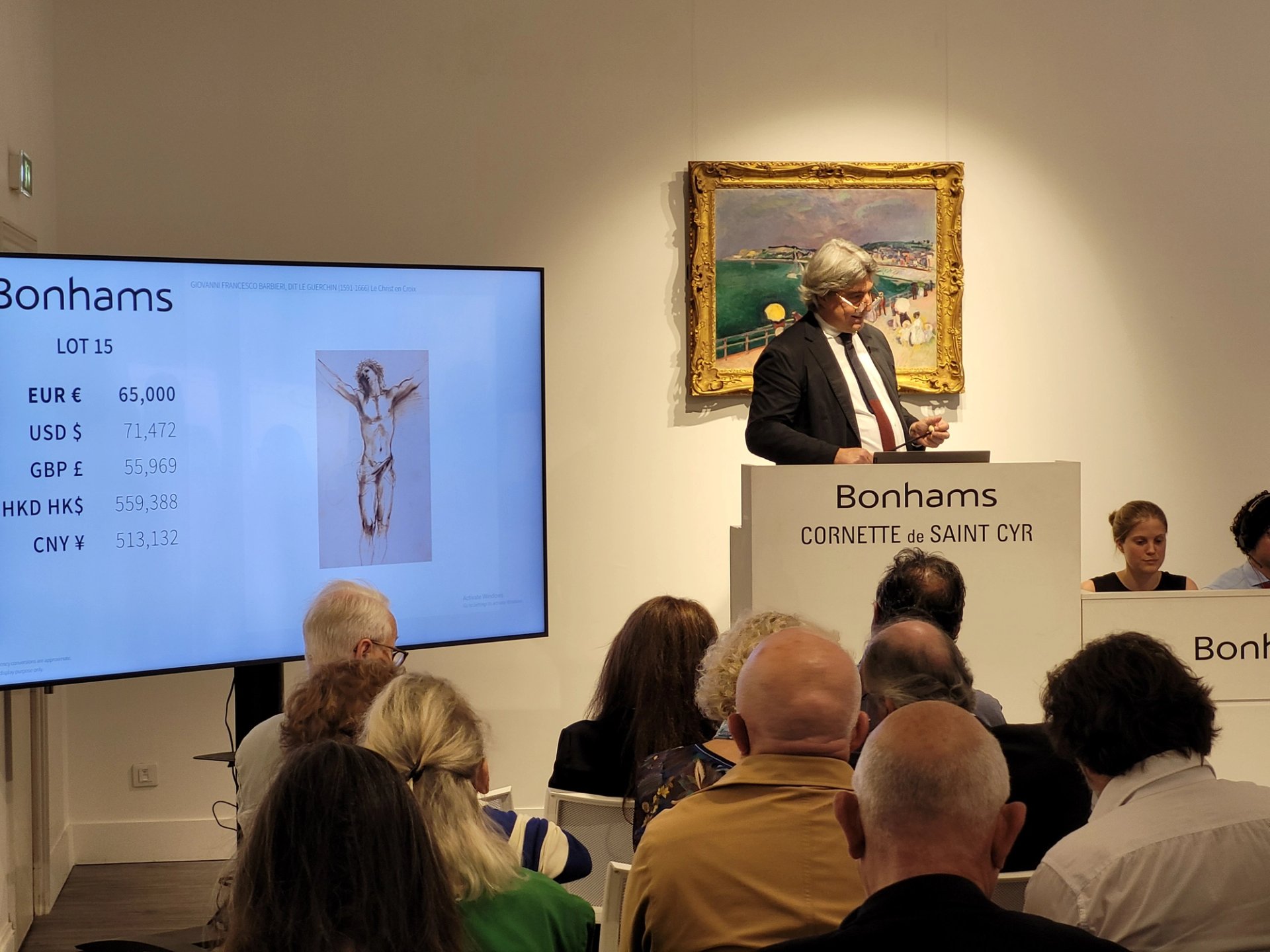 Vente de la collection d'Alain Delon chez Bonhams Cornette de Saint Cyr à Paris en 2023, avec à l'écran un dessin du Guerchin, en face un tableau de Raoul Dufy et au mur à droite une peinture d'Albert Gleizes. Photo A.C.