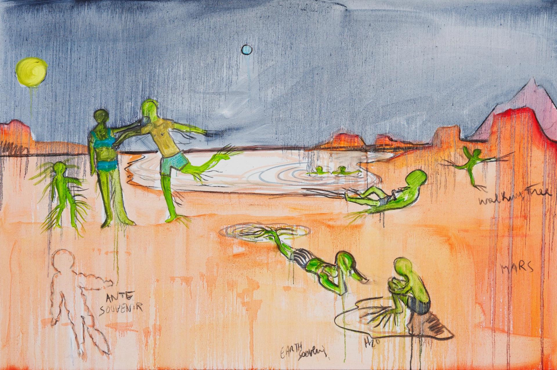 Fabrice Hyber, Martiens à la plage, 2022, huile et fusain sur toile, 97 x 146 cm. © Droits réservés, Fabrice Hyber, Adagp, Paris 2024