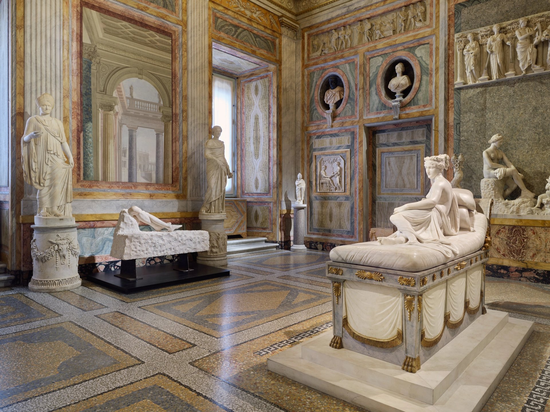 À Rome, une vingtaine de sculptures dialoguent avec l’architecture et les collections uniques rassemblées dès le début du XVIIe siècle par le cardinal Scipione Borghese, lequel bénéficia pour ce faire de l’appui de son oncle, le pape Paul V. Le prince Camillo Borghese a œuvré, à partir de 1818, à donner sa forme actuelle à la Galleria Borghese, située au sein du vaste parc arboré de la villa sur la colline du Pincio. Second mari de Pauline Bonaparte, sœur de Napoléon, il a complété la collection, qui compte sculptures hellénistiques, romaines, œuvres du Bernin, de Raphaël, de Caravage ou encore d’Antonio Canova.