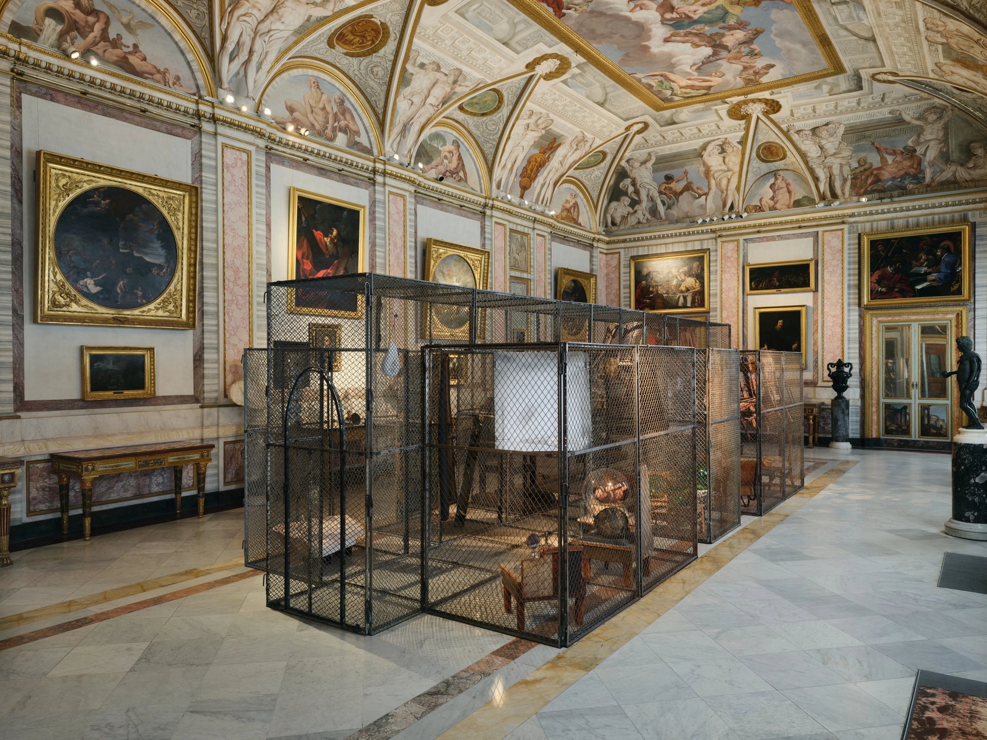 Parmi les pièces majeures de l’exposition romaine, Cell (The Last Climb) (2008), réalisée deux ans seulement avant sa mort, impressionne par sa présence au centre du Salone di Mariano Rossi. L’authentique escalier en spirale de l’atelier de Louise Bourgeois à Brooklyn est entouré d’une constellation de sphères de verre azurées – leur couleur imite le ciel de La Madone au baldaquin (vers 1685) de Luca Giordano, conservée au Museo di Capodimonte, à Naples, où l’œuvre a été montrée pour la première fois en 2008. Ouverte sur l’infini après la dernière marche, elle revêt une forte connotation spirituelle, telle une métaphore du cycle sans fin de la vie. Cette « ultime ascension » métaphysique à l’architecture minimaliste dialogue avec l’une des peintures baroques du plafond, une allégorie de la vérité dévoilée par le temps, dans laquelle une femme tient un orbe traversé par la lumière.