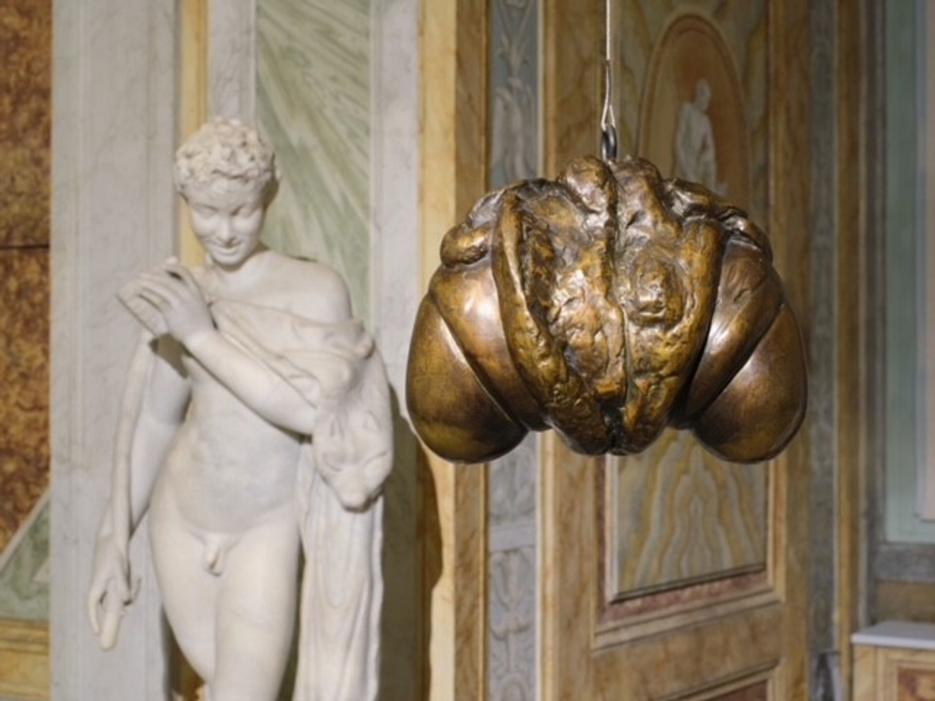 Dans la Sala degli Imperatori ont été disposées des têtes en tissu dont l’apparente fragilité et la modestie des matériaux contrastent avec l’autorité de fiers bustes romains en albâtre et porphyre. Plus loin, Janus fleuri (1968), sculpture en bronze montrant deux phallus mis dos à dos, si l’on peut dire – leur étrange union crée in fine un sexe féminin –, est suspendu à côté de l’antique Hermaphrodite endormi. Un clin d’œil au goût de Louise Bourgeois pour une certaine provocation joyeuse. Sur une célèbre photographie de Robert Mapplethorpe, l’artiste pose, le regard malicieux, avec sa sculpture Fillette – un colossal pénis en érection – sous le bras.