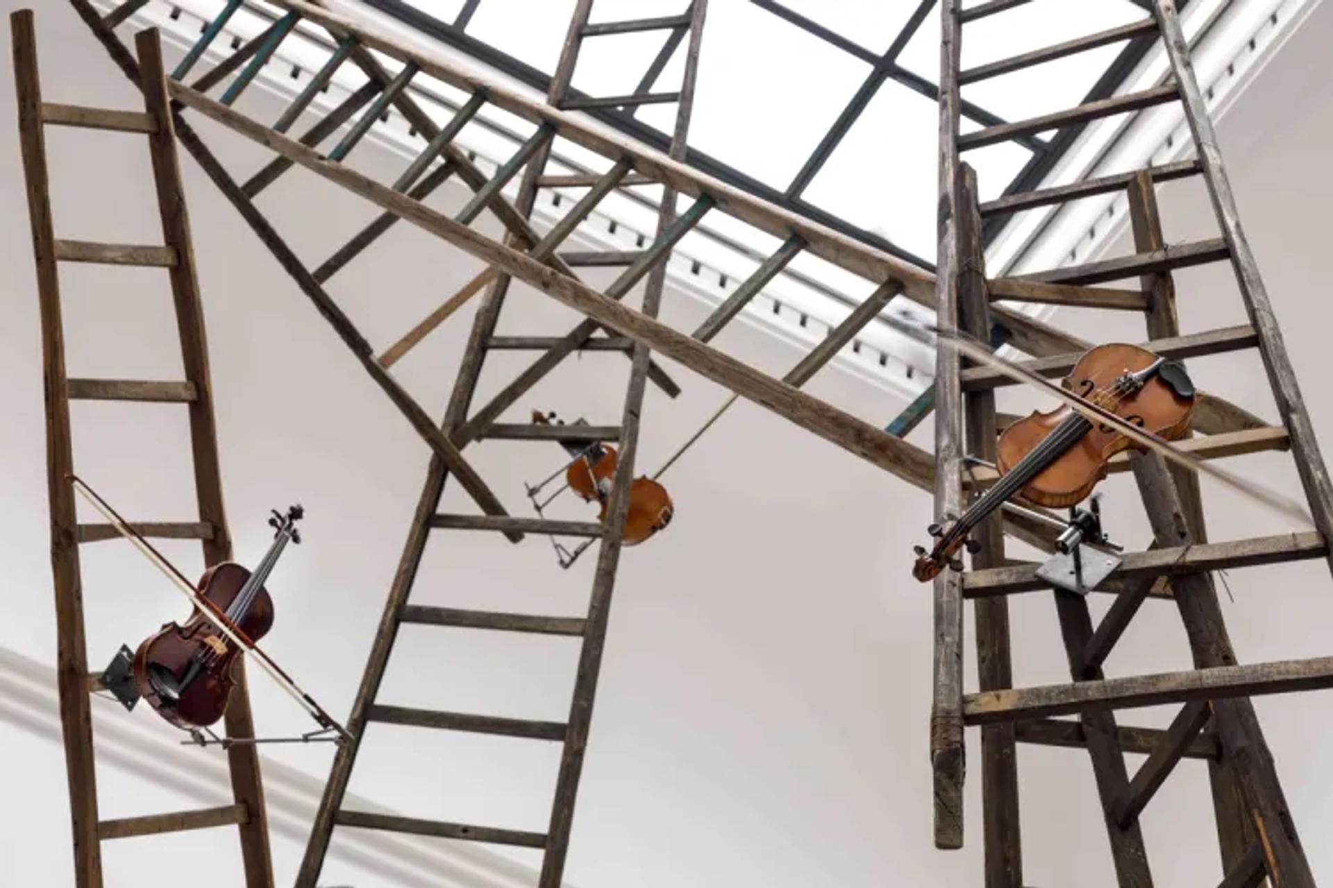 Cette semaine, la galerie Thomas Schulte, basée à Berlin, inaugure précisément une exposition consacrée à Rebecca Horn, intitulée « Concert of Sighs » (11 septembre-2 novembre 2024). « Des palettes de construction, des fragments de murs et des planches de bois sont empilés sur le sol, d’où partent de minces tubes de cuivre qui s’enroulent comme des pousses de plantes et se terminent par des trompettes en forme d’entonnoir. L’artiste a utilisé des matériaux de construction provenant des ruines de maisons vénitiennes pour son installation, créée à l’origine pour la Biennale de Venise de 1997 », explique la galerie.