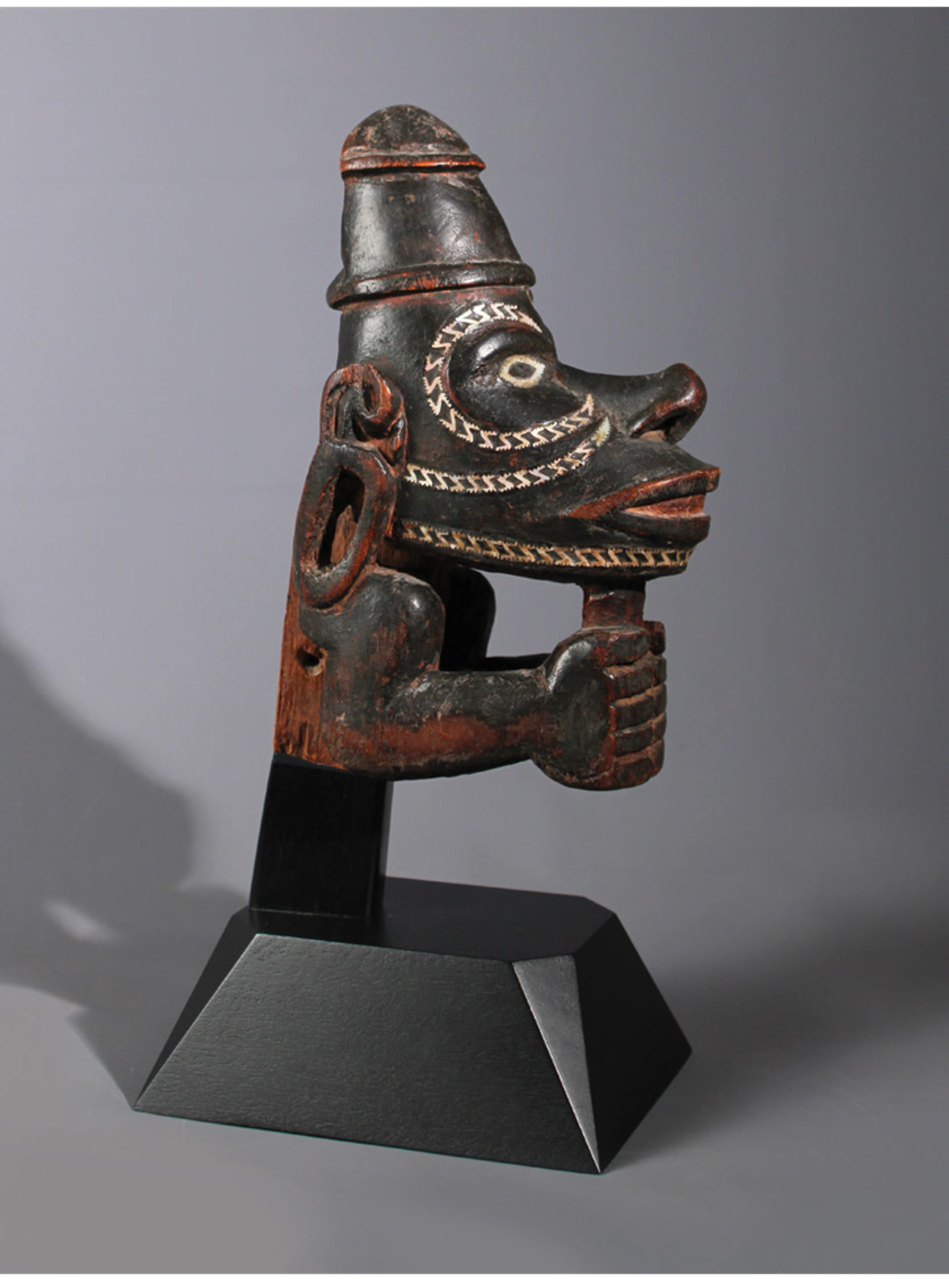 « Afin de commercer ou de mener des expéditions, la population des îles Salomon voyageait grâce à de longues barques légères. Ces pirogues transportaient les hommes d’une île à une autre et présentaient, à l’avant de l’embarcation, des figures de proue dites “nguzunguzu”. Ces dernières étaient destinées à protéger les occupants de la barque, notamment face à la mer, et à ouvrir la voie aux navigateurs, avant d’être placées à l’abri une fois de retour sur terre. Sur cette pièce, on retrouve un riche décor, avec des incrustations de nacre dans le bois, une technique très complexe. Cet objet a été référencé très tôt, en particulier aux États-Unis par le marchand John J. Klejman dans les années 1950, avant d’être exposé au Arts Club of Chicago en 1966. »