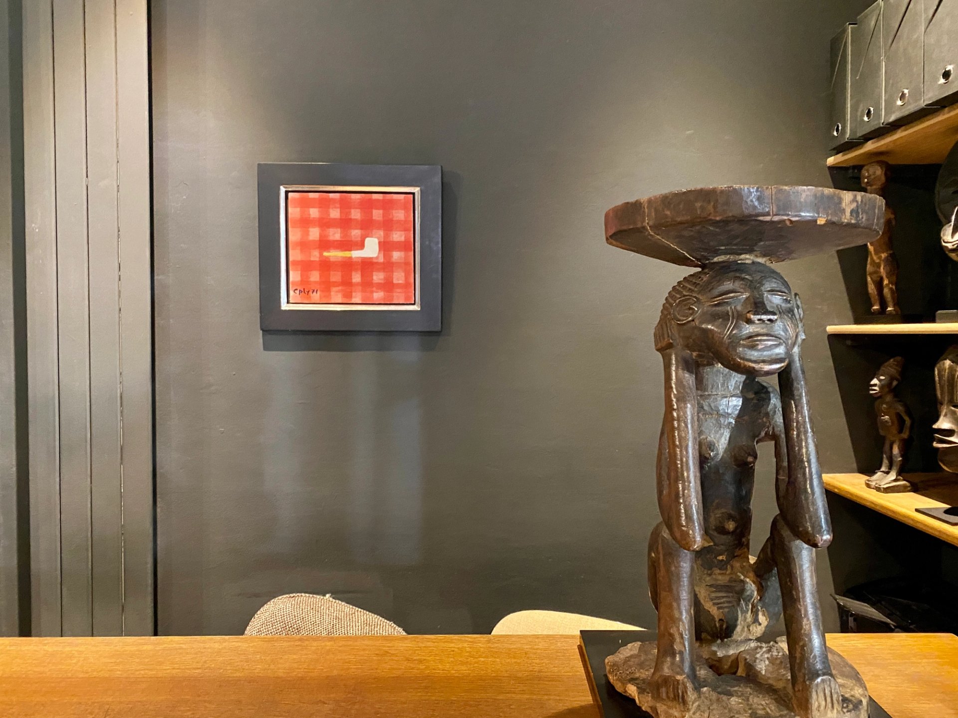 Chaise rituelle Chokwe et tableau de William Copley, Galerie Patrik Fröhlich. Photo D.R.