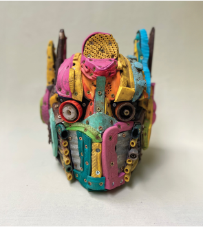 Simon Vega, Optimus Gomme, série TrashFormer, 2023, plastique, bois, aluminium, sandales en caoutchouc trouvées, métal et objets. © Simon Vega. Courtesy de 193 Gallery