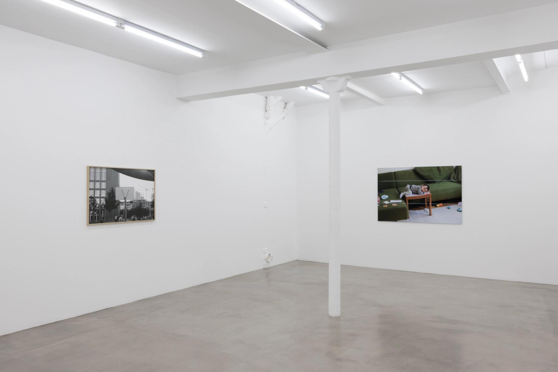 La première photo que l’on voit en entrant, c’est celle d’une enfant de deux ou trois ans qui nous regarde. Elle est allongée sur une petite table devant un sofa. Il s’agit vraisemblablement de la fille de Niklas Taleb, une photo de famille donc, mais le choix du cadre et le format plutôt grand lui donnent des allures de tableau de genre. En s’approchant, on remarque que la photo est divisée en trois bandes horizontales et chacune d’elles protégée par une bande de verre. Les bandes de verre sont raccordées entre elles par de minces morceaux d’adhésif transparent. L’artiste encadre lui-même ses photographies et ce principe de division de l’image est récurrent. Ce caractère faussement amateur a pour effet d’opérer des recadrages à l’intérieur de l’image et de suggérer une construction polyptyque.