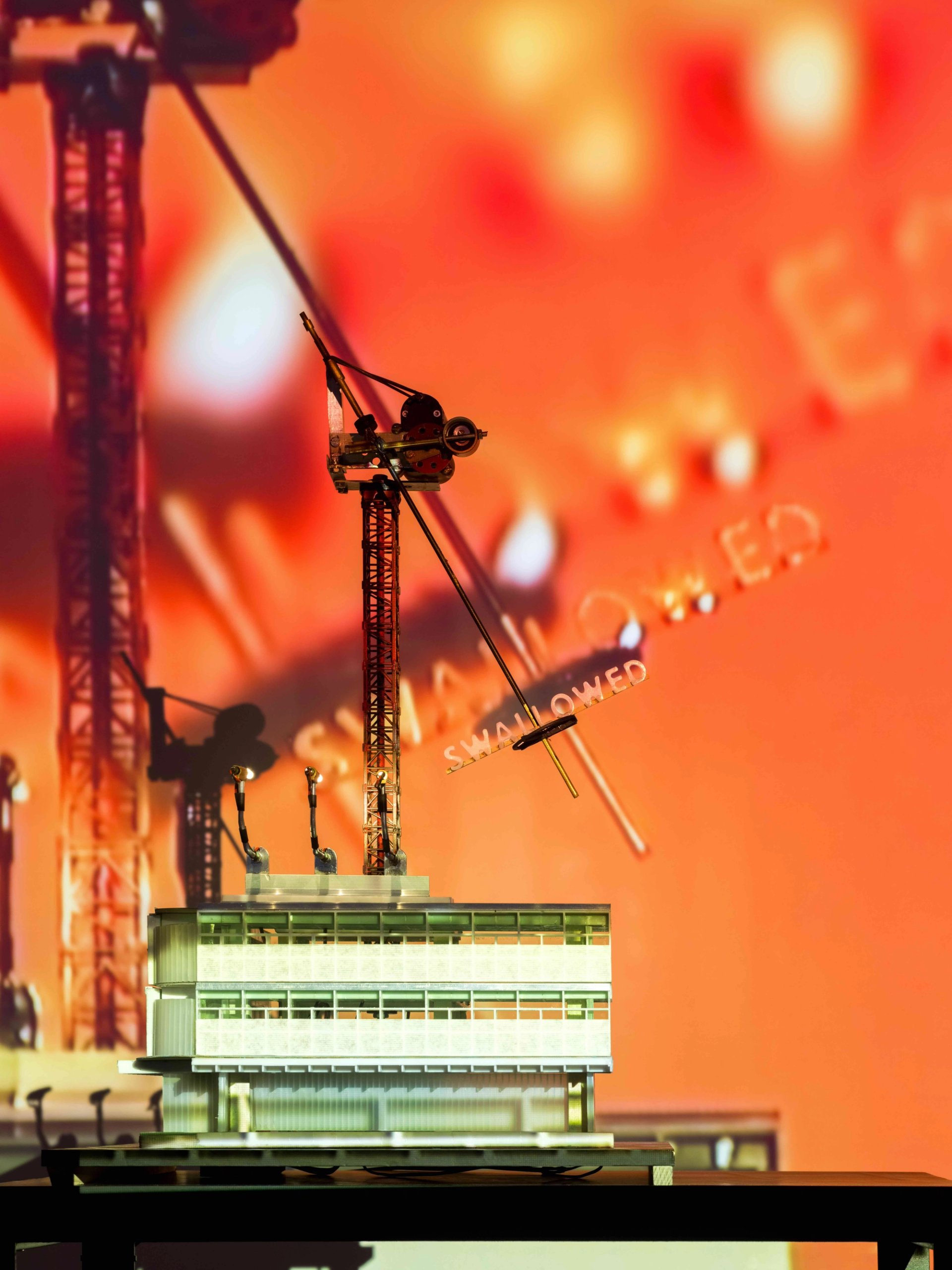 « Swallowed », soit avalé, ou englouti, c’est un mot que l’on trouve dans l’une des trois nouvelles installations pour salles obscures que présente Bertrand Lamarche. Les trois installations sont chacune constituées d’une maquette d’architecture disposée sur une table, éclairée par de petits spots, et filmée par une caméra en circuit fermé qui projette l’image sur le mur. Sur chacune des maquettes un texte ou bien un mot tourne de façon ininterrompue et, grâce à de minuscules miroirs, les lettres se trouvent démultipliées sur l’écran. Le mot « Swallowed » est lui porté par le bras animé d’une sorte de grue. À travers ces dispositifs qui évoquent les trucages du cinéma ancien, Bertrand Lamarche nous invite à nous projeter dans un espace de fiction critique. Les maquettes sont des barres modernistes très standards, et les textes sibyllins paraissent renvoyer au processus lui-même et à des questions plus larges. Entrent un jeu la fascination de l’image animée, celle des villes, mais aussi certainement la question de la place du spectateur.