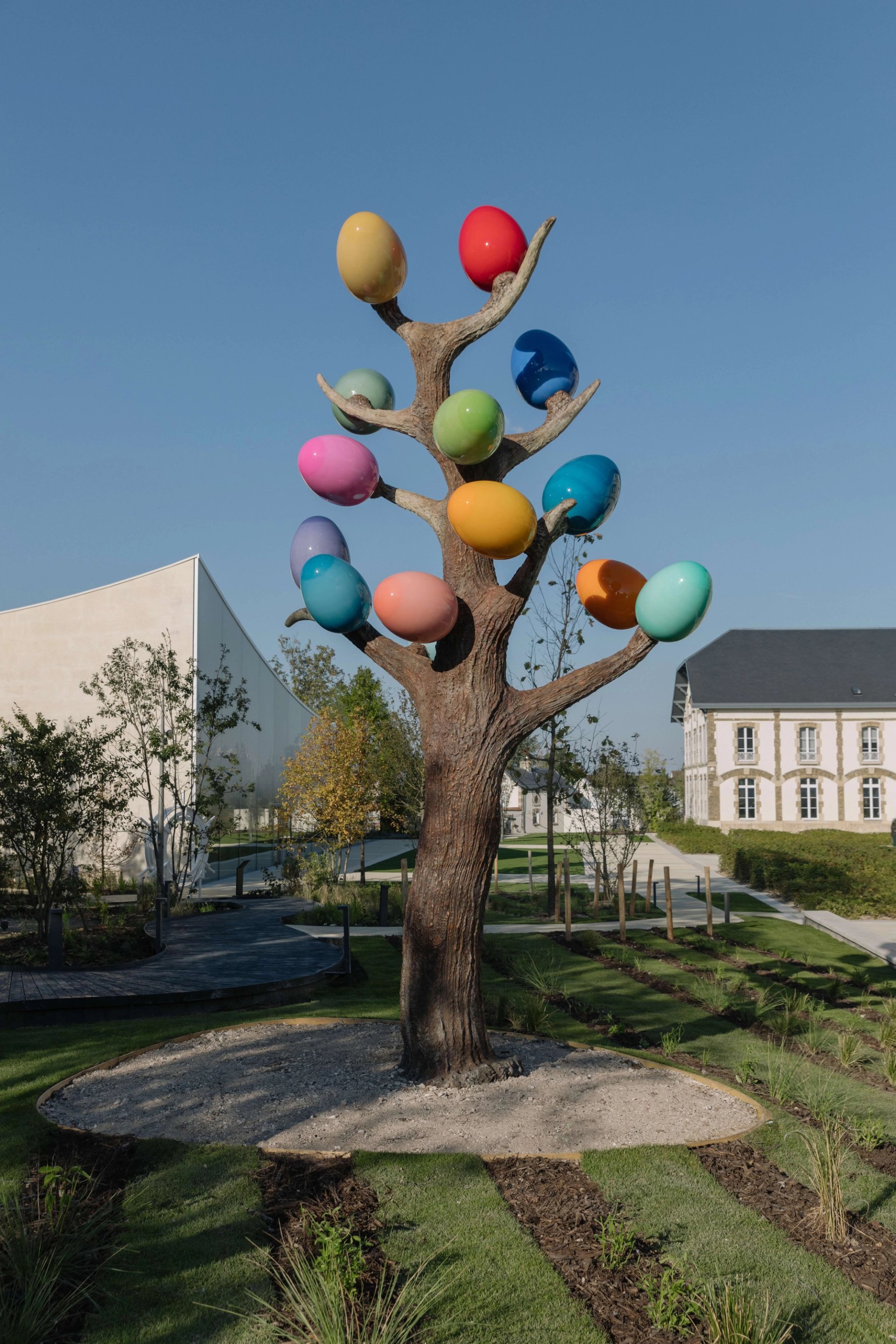 Cette action en faveur de l’art et des artistes, qui fait depuis longtemps partie de l’identité de la maison, vient de trouver un point d’orgue avec la métamorphose de son adresse emblématique au 4 Rue des Crayères à Reims. Après trois ans de travaux, un nouveau bâtiment a été inauguré sur le site : le pavillon Nicolas Ruinart, une maison de verre au design épuré conçue par l’architecte japonais Sou Fujimoto. L’aménagement des espaces (bar, salons, boutique) a, quant à lui, été confié à l’architecte d’intérieur Gwenaël Nicolas dont les créations évoquent subtilement l’effervescence du vin produit sur place. À l’extérieur, l’artiste paysagiste Christophe Gautrand a imaginé un parc de sculptures. Le parcours est rythmé en particulier par les œuvres de Pascale Marthine Tayou, Jeppe Hein et Eva Jospin, déjà nommés, mais aussi de NILS-UDO – avec La pierre, évocation du réseau souterrain creusé sous le site pour conserver le précieux breuvage –, ou encore de Dewar & Gicquel avec leurs trois sculptures monumentales en pierre de Chauvigny évoquant métaphoriquement le travail de la vigne – une chaussure de travail, un escargot et une flûte à bec.