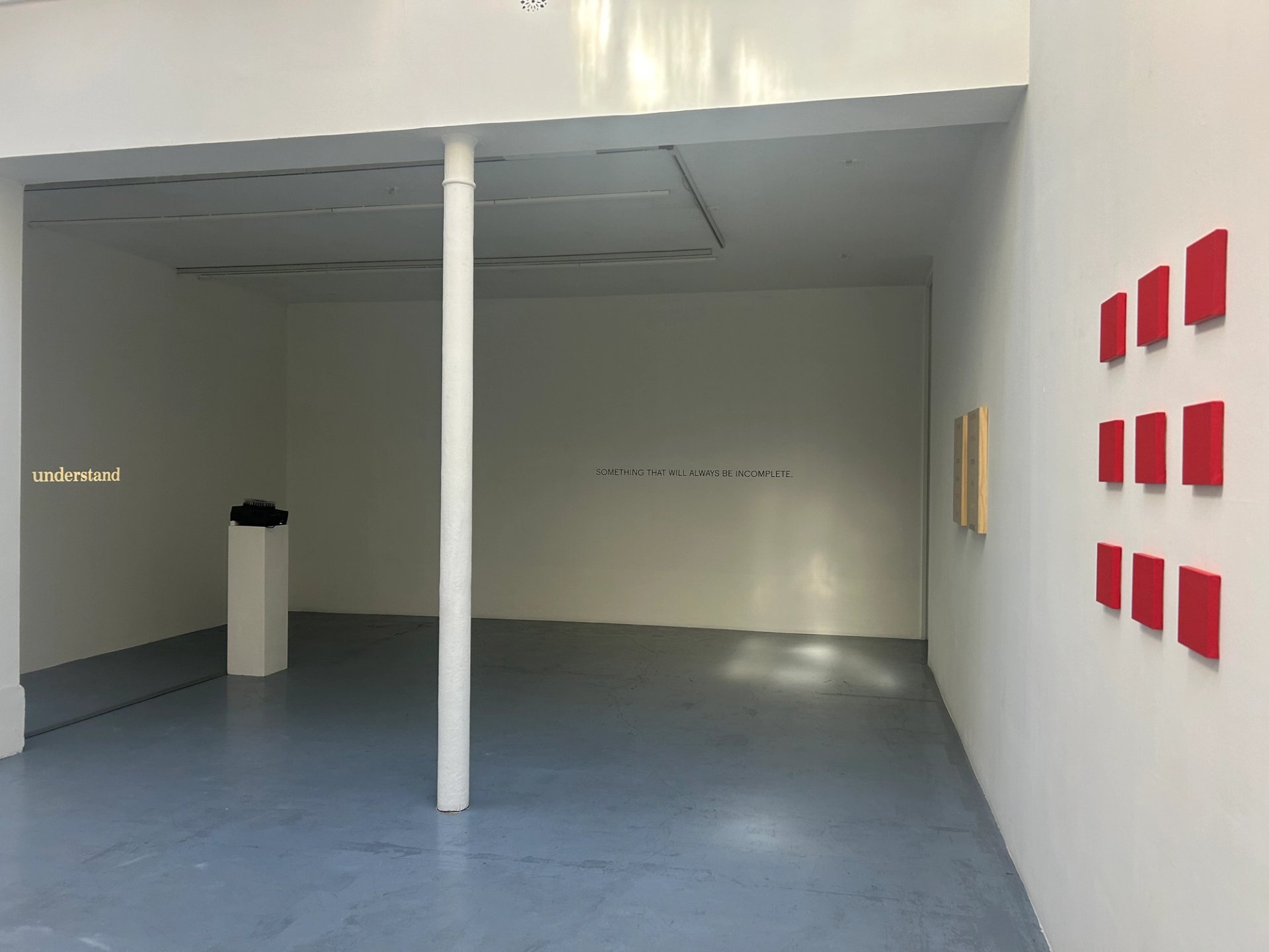 Parmi les créateurs de l’art conceptuel, Robert Barry apparaît comme un véritable amoureux du mot unique (il n’emploie qu’exceptionnellement la locution) sans préférence marquée pour sa catégorie, mot toujours pensé en situation : sur un mur, un sol, un tableau. Le mot isolé ou dans une liste est pour l’artiste un constructeur d’espace. L’espace, c’est aussi l’un des grands sujets de Barry. En préambule à ce florilège d’un demi-siècle de création, on découvre un large anneau de cuivre tendu par des fils exactement au milieu de la surface du mur qui se trouve derrière lui. Certains verront d’abord un anneau, d’autres ne verront que lui, mais d’autres encore se prendront à considérer l’espace autour de l’anneau. Revenons aux mots, présents dans la plupart des œuvres choisies pour cette exposition. Prenons l’adjectif « incomplete » qui figure dans deux des œuvres. À une description de 1969-1970 écrite sur un mur en lettres adhésives – Something that always be incomplete – fait écho ce tableau de 2024 peint sur un petit panneau de bois sur lequel est écrit blanc sur blanc (seul le léger relief des lettres permet de lire) : incomplete. Ce sont deux types d’exercices de pensée qui s’offrent à nous, l’un à partir de la situation, l’autre à partir du modèle pictural. Les deux œuvres se rejoignent dans la volonté de s’étendre au-delà de la surface qui leur semble assignée. Également de 2024, figurent deux groupes de huit petits tableaux carrés, l’un rouge et l’autre bleu clair. Chacun des tableaux porte un mot sur le côté, ton sur ton, qu’on ne découvre qu’en s’approchant. L’expérience de la couleur pure et le respect de la planéité n’empêchent pas de penser au-delà de ce qui s’offre à la vue. En plus de films et d’un diaporama, l’exposition nous permet de découvrir une pièce inédite de 1969. Sur une feuille, Robert Barry avait jeté cette idée : « For an exhibition : a dark room ». La feuille dans sa pochette plastique est fixée au mur, la chambre obscure n’attend que nous.