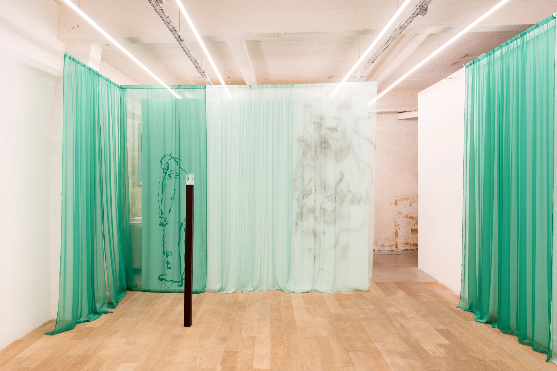 « Vert pétri d’eau », c’est la pierre péridot qui a inspiré à Paul Maheke ce titre beau et étrange. Ce participe passé glisse le sens du toucher à l’intérieur d’une couleur. Vert d’eau, c’est sous une nuance marquée et une autre diluée, la couleur des rideaux qui couvrent la plus grande partie des murs de la galerie. Ces rideaux ont été confectionnés avec de la mousseline, ils laissent voir par transparence des dessins peints sur le mur et certains portent eux-mêmes des dessins imprimés sur leur surface. Il s’agit de figures humaines ou hybrides, ces dernières pouvant être rapprochées de grotesques. Ces dessins plus ou moins voilés, plus ou moins nets, apportent avec eux la vision de lieux imaginaires, de palais fabuleux.