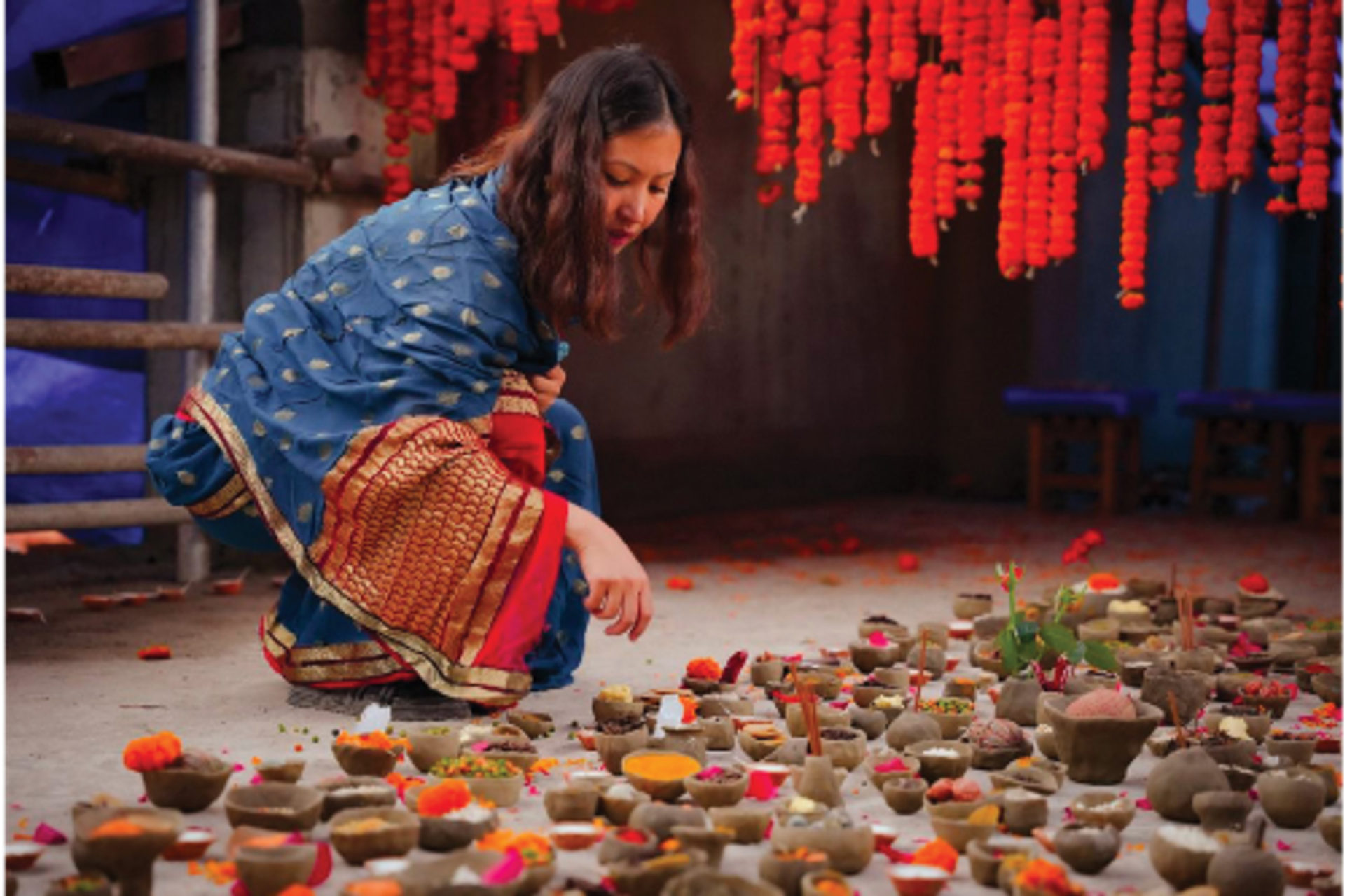 Vue de l’installation Ancient Desires – One taste (récipients en céramique et offrandes) de Charwei Tsai, Licchavi House, Katmandou, Népal, 2024.