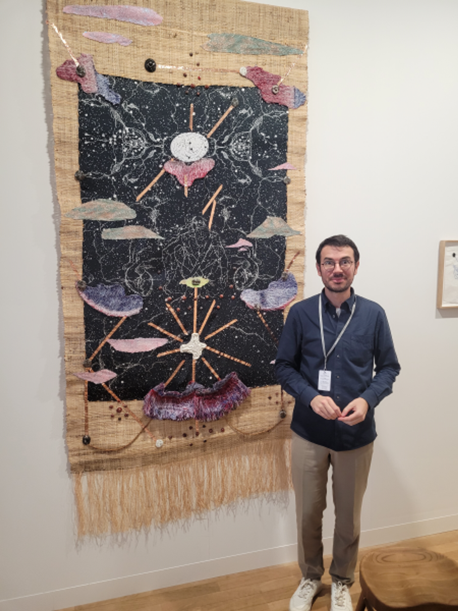 Francis Coraboeuf devant une œuvre de Marie-Claire Messouma Manlanbien, galerie Cécile Fakhoury. Photo A.C.