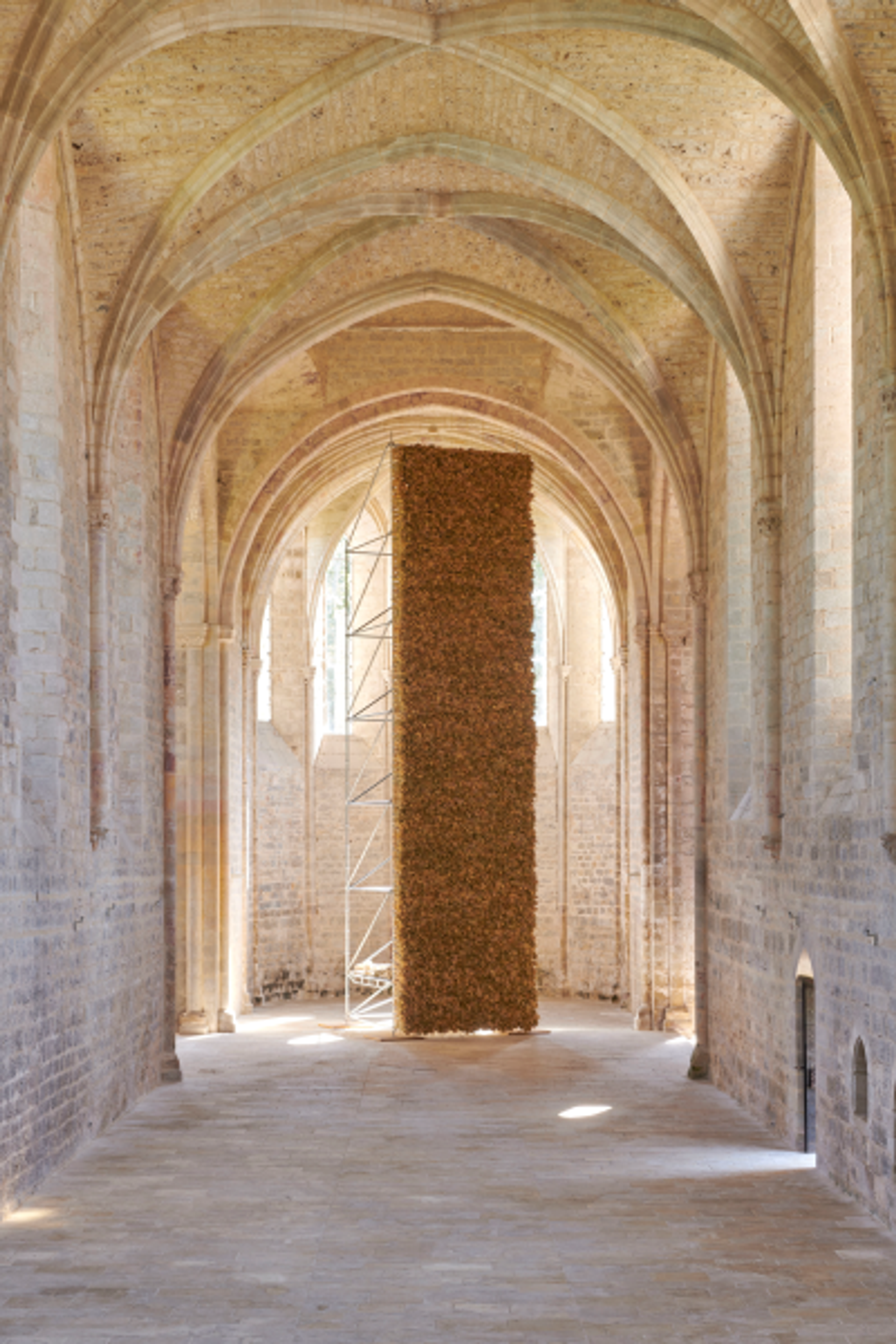 « L’enjeu le plus complexe, lorsque l’on crée une pièce in situ, qui plus est une installation monumentale et éphémère, est d’y instiller une âme en faisant attention à ce que l’une – l’œuvre – “n’écrase” pas l’autre – l’église, énonce Benoît Grécourt, administrateur du site. Tadao Cern est venu à l’abbaye en septembre 2023 et a eu un choc dès qu’il est entré dans l’édifice. Il y est resté très longtemps, environ une heure, seul, pour s’approprier l’endroit. C’était très touchant. Certes, l’espace est envoûtant, mais son ampleur effraie parfois. Tadao Cern, qui est architecte de formation, a eu une réelle compréhension du lieu. Il a aussi posé beaucoup de questions : sur l’intégration de l’abbaye dans son territoire, sur les terres agricoles et leur rôle nourricier, à l’époque, pour les moines et la population alentour... Cela fait un certain temps que cet artiste travaille autour du blé et sa symbolique, sur le thème de la régénérescence – ce grain devient épi, lequel donnera une graine qui tombera en terre et bis repetita – et de la perpétuation de la vie. »