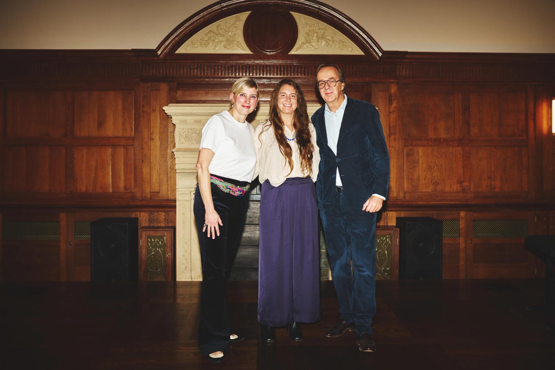 La photographe Ana Elisa Sotelo, lauréate du Thinking Sustainability* Photography Prize (*Penser le développement durable) avec Audrey Bazin, directrice artistique de la Fondation Louis Roederer et Frédéric Rouzaud, directeur général de la maison de champagne Louis Roederer et président de la Fondation Louis Roederer, lors de la soirée de remise du prix le 7 novembre 2024 au Reid Hall, à Paris. © Alexis Anice