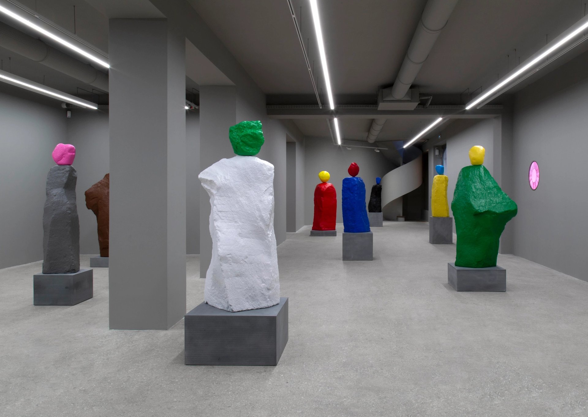 Les Nuns and Monks sont apparus il y a quatre ans dans l’œuvre d’Ugo Rondinone. D’abord taillées grossièrement dans la pierre et reproduites en bronze peint, ces figures ont pris la suite des sculptures monumentale érigées sur la Rockefeller Plaza à New York et des Seven Magic Mountains dispersées dans le désert du Nevada près de Las Vegas. Elles sont constituées d’un imposant bloc vertical pour représenter le corps sous la robe et d’un petit bloc pour la tête. Les deux blocs sont de couleurs distinctes, alternant les effets d’harmonie et ceux de stridence. Les Nuns and Monks sont cette fois en basalte et acier inoxydable peints, à taille humaine sur des bases de ciment, et en figurines posées sur des socles au mur. Au nombre des sources d’inspiration, Ugo Rondinone cite le Cardinal de Giacomo Manzu et dit avoir voulu dans ces œuvres réunir « le moi intérieur et le monde naturel ». On peut penser aussi au Moine au bord de la mer de Caspar David Friedrich. L’exposition se tient dans les deux galeries de la rue du Pont de Lodi à Paris. Dans l’une d’elles, une figure solitaire est tournée vers l’escalier qui mène au sous-sol ; dans l’autre des moines et nonnes dispersés regardent vers un escalier qui monte. Ce dernier groupe est environné de cadrans d’horloge en vitrail à l’axe décalé qui font depuis longtemps partie du vocabulaire de l’artiste. Dans chacune des galeries, on trouve également de très grandes aquarelles sur toile, Suns and Moons, des levers ou couchers de soleil dans des teintes arbitraires mais qui se réfèrent à un jour et à une circonstance précis. Au pied d’un des tableaux, on trouve quelques bougies à demi fondues, réalistement rendues en bronze peint. Si nonnes et moines exercent une fascination sur Ugo Rondinone, celui-ci d’une certaine façon les ramène dans le monde autant par la couleur que par différents marqueurs temporels.