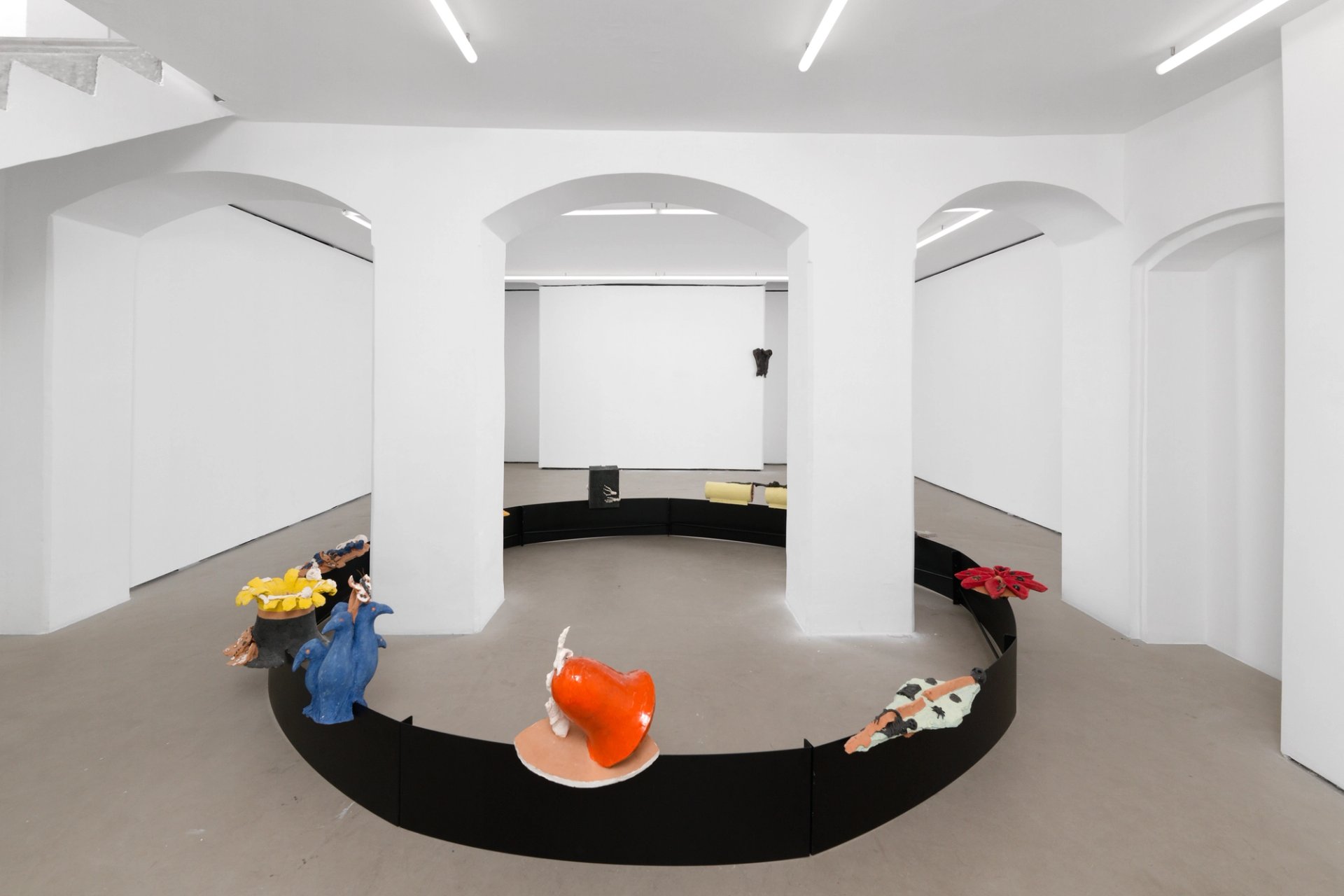 Entre ces ensembles sont disposés d’un côté le relief d’une double cloche en bronze qui épouse deux faces d’une colonne et un grand tableau enduit de ciment. Sur le tableau figure une colonne de bois sur laquelle est couché un squelette. Après être passé sous une figure en bronze suspendue, une madone à visage de chat, on découvre au sous-sol un large anneau d’acier entourant deux colonnes. Sur l’arête de l’anneau sont posées une dizaine de céramiques dans des styles divers, avec l’omniprésence du squelette. À travers ce parcours, cryptique à tous les sens du terme, Enzo Cucchi inscrit ses pas dans une histoire collective, à la fois poète et mémorialiste.