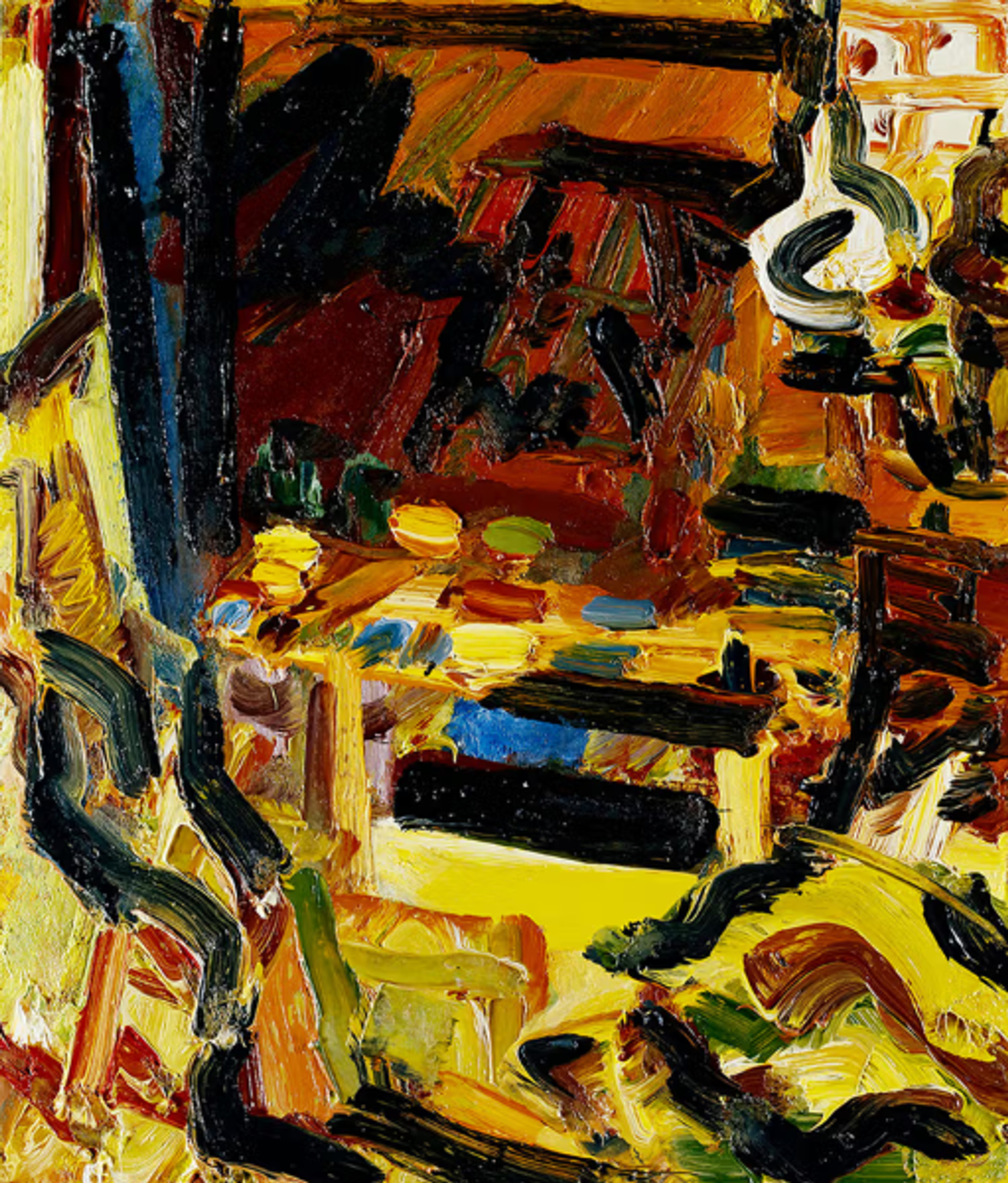 La deuxième peinture épiphanique a été réalisée une fois qu’il a obtenu une place pour poursuivre ses études au Royal College of Art (1952-55). Lors d’une « crise » d’excès de confiance, alors qu’il se sentait obligé de se conformer aux exigences conservatrices de l’école d’art, Auerbach a tourné les talons et a regardé les excavations qui descendaient et les échafaudages qui montaient sur un chantier caverneux de Earls’ Court Road. Ce sont ses portraits de femmes, très travaillés et retravaillés, ainsi que l’activité urbaine frénétique d’un Londres en pleine transformation qui ont défini sa contribution à la tradition figurative britannique. À partir de ce moment-là, l’artiste a rarement cherché des sujets ailleurs.