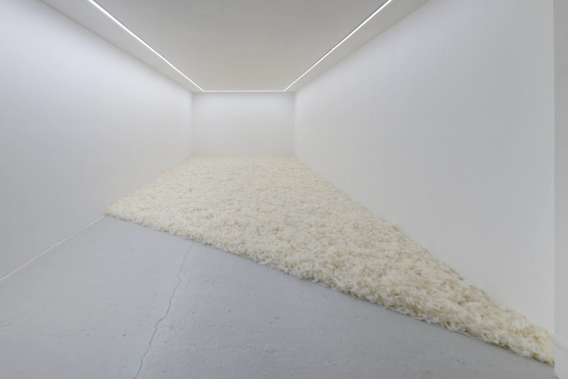 Les photos argentiques en noir et blanc sont petites et dispersées sur les murs à des hauteurs inhabituelles et modifient notre perception du lieu. Ce sont toujours des vues décentrées ou des détails. De la façon dont elles sont exposées, le visiteur se trouve amené à reproduire l’effet de découverte éprouvé par leur autrice. Nous sommes appelés à leur prêter attention plutôt que mis en arrêt par un effet accrocheur. C’est un sentiment de flottement, légèrement hypnotique, que transmet également un film en 16 mm qui montre la chute de plumes une par une. En poursuivant dans les profondeurs de la galerie, on trouve un sol divisé en oblique par un amas de plumes de canard. Le titre long et poétique change cet amas en écume.