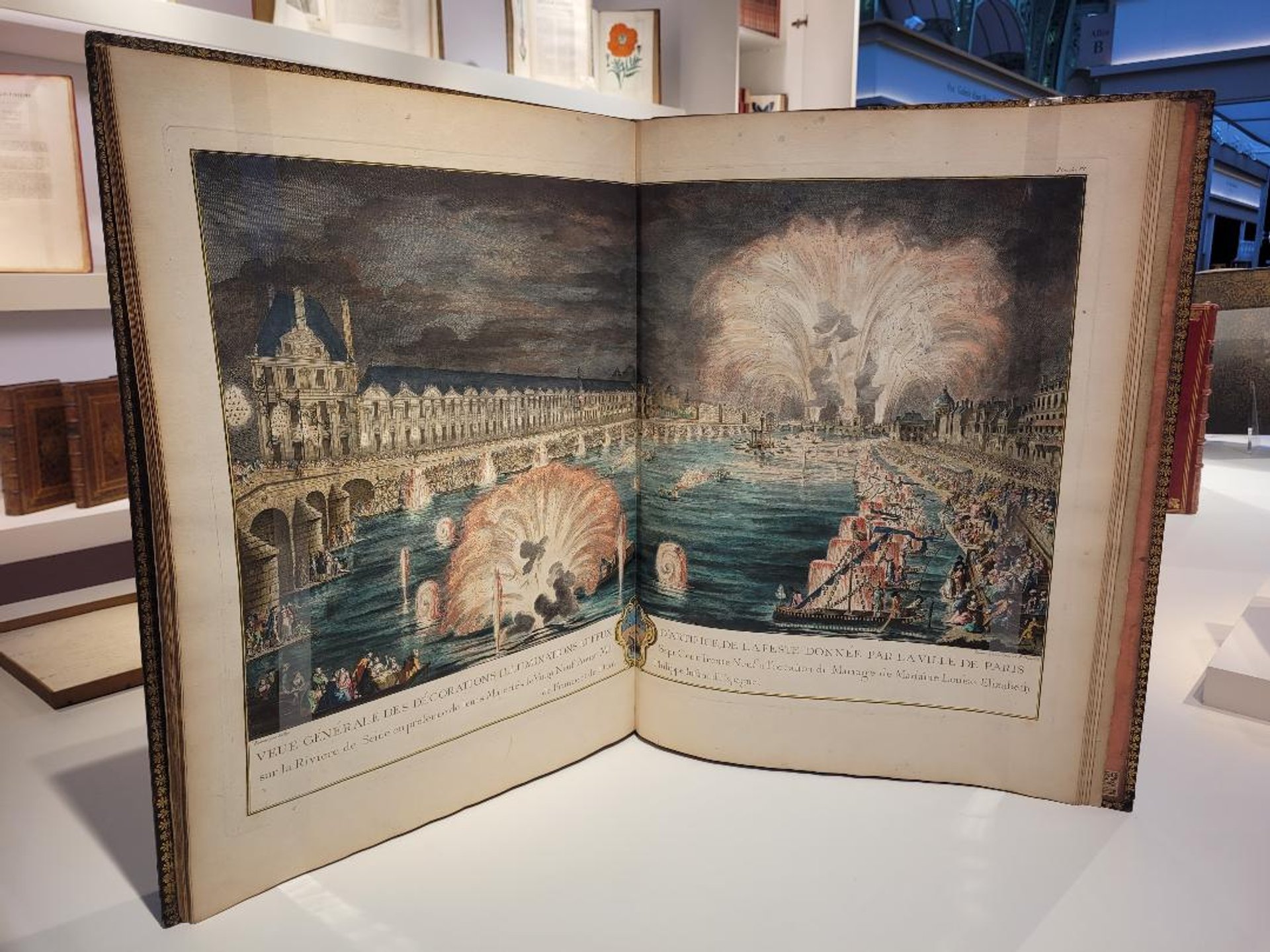 Paris reste une fête ? La librairie Camille Sourget expose entre autres un ouvrage recensant et dépeignant les festivités données par la Ville de Paris pour le mariage de Louise-Elisabeth de France et réalisé en 1740, orné de gravures coloriées à la main à l’époque, une merveille à 75 000 euros.