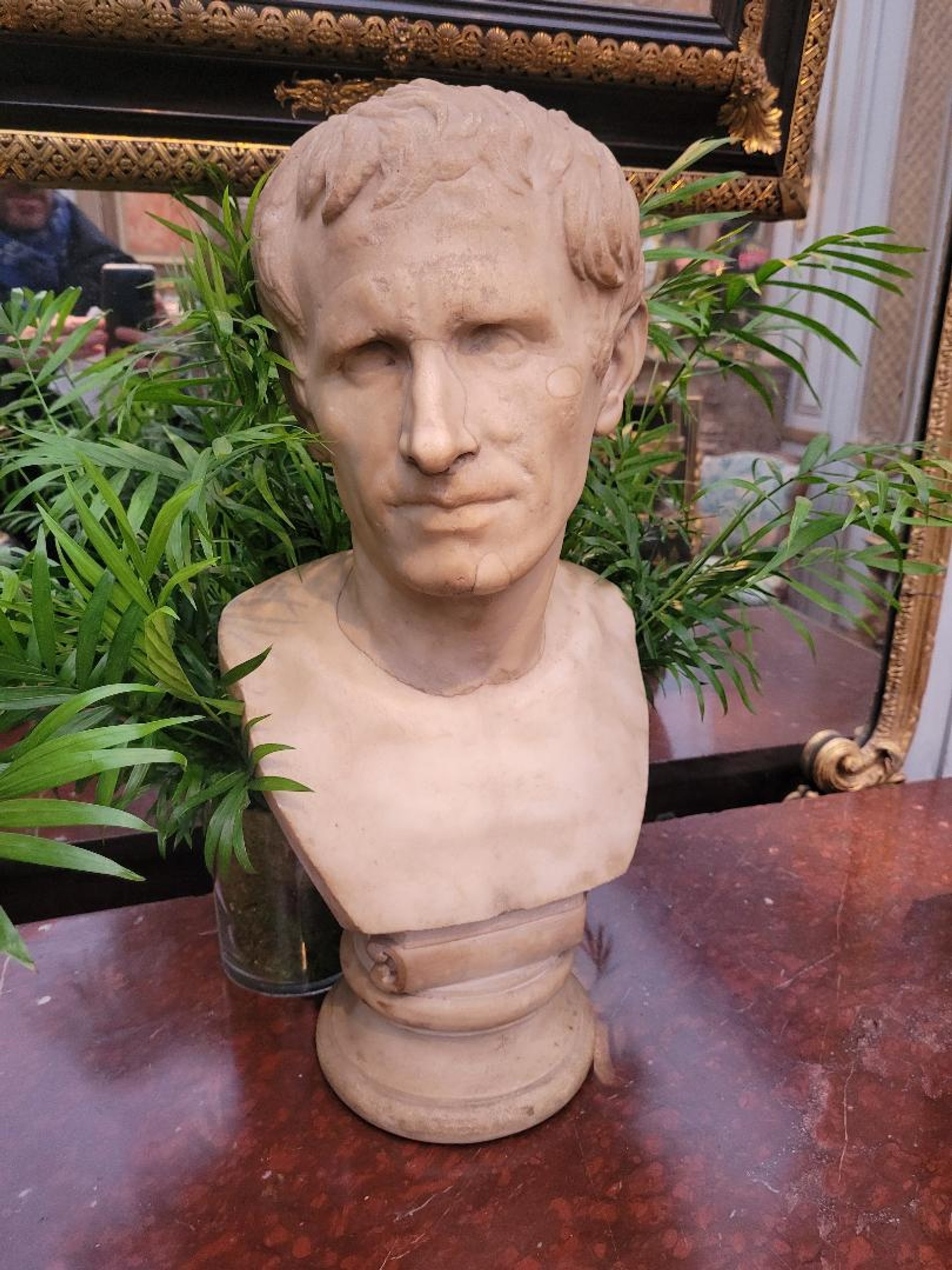 L’antiquaire parisien associe, comme à l’accoutumée, boiseries précieuses, commodes Grand Siècle et quelques sculptures, tel ce buste présumé du grand Jules César. Selon la galerie, « on connaît peu de bustes de lui, ceux qui sont restés datent de la période julio-claudienne [- 27 avant J.-C. à 68 après J.-C. ] ». Le seul modèle comparable serait un exemplaire se trouvant dans la galerie Colonna à Rome.