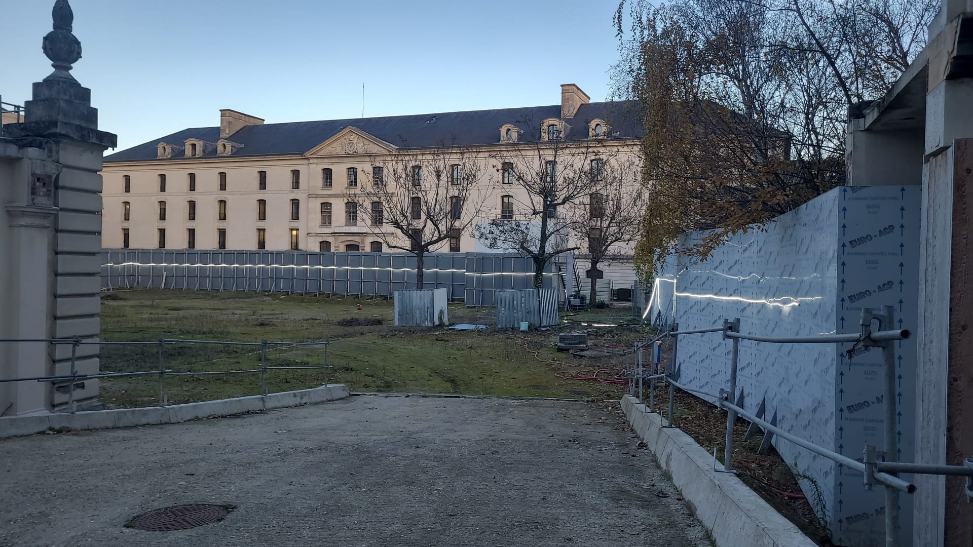 Le "Jardin carré" de l'école Polytechnique, fin novembre, où l'on constate l'absence de la sculpture de Meret Oppenheim et du bassin. Photo A.C.