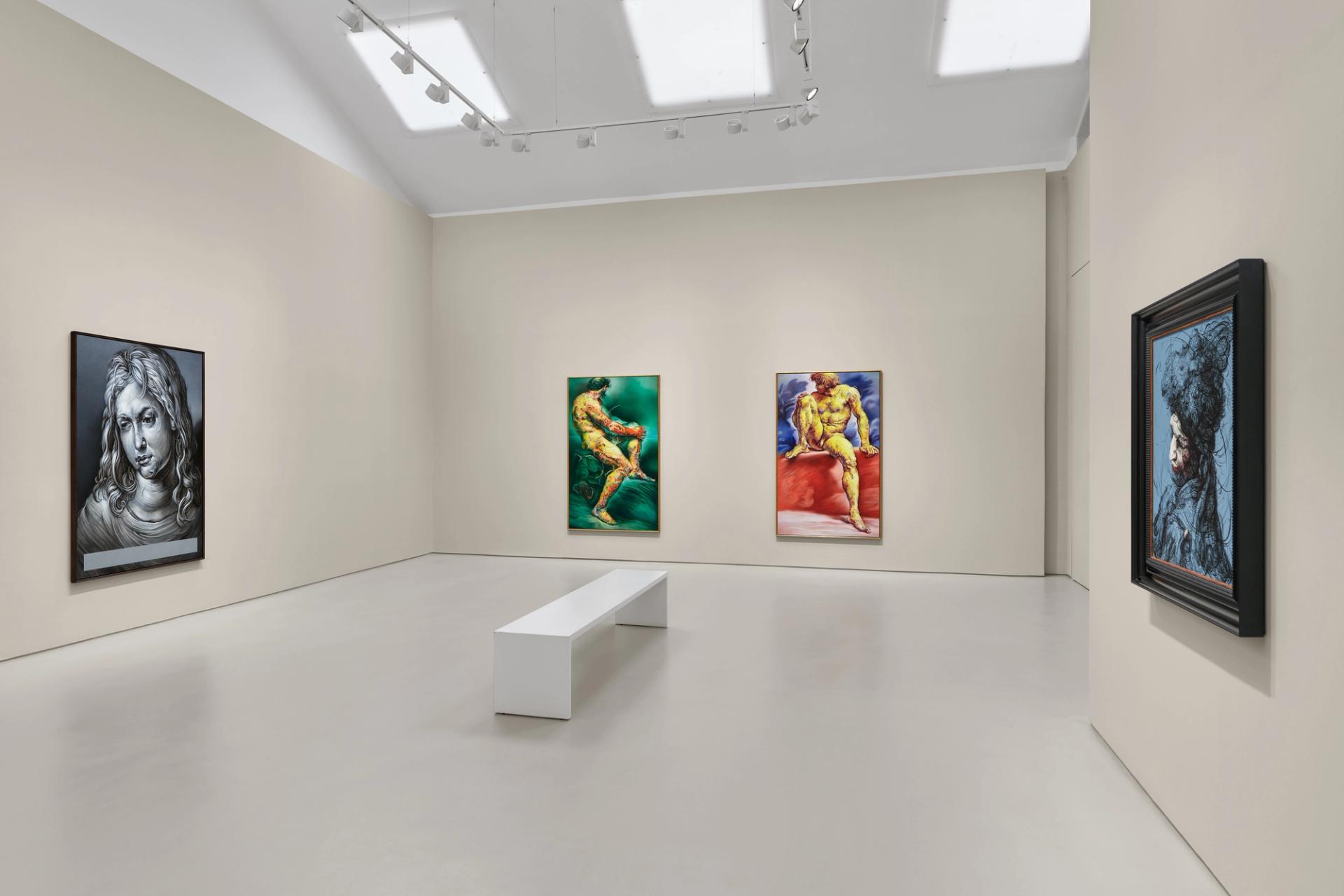 Pour « In the Altogether » (mise à nu), Glenn Brown a réuni des anges et des colosses inspirés de maîtres anciens dans des couleurs d’une formidable outrance. Aux taches et coups de brosse qui font l’image du travail du peintre, il a depuis longtemps substitué des milliers de traits et boucles pour peindre la chair comme on peindrait chevelures et poils. Il a inventé des corps et des faces picturaux à la fois grouillant et lissés qui lui permettent de réinterpréter à peu près tous les styles qu’il admire à des degrés divers, du sublime au kitsch. Parallèlement à cette virtuosité qui se contemple et vise à conduire le spectateur au vertige, Glenn Brown élabore de subtils jeux de nature conceptuelle. Partant de deux dessins de Dürer représentant l’un, un visage de christ imberbe, et l’autre, celui d’un ange, il a peint deux tableaux qu’il met en regard chacun sur son mur. La tête du Christ est peinte en noir et blanc avec en bas un cartel gris où aurait pu figurer le titre. Le tableau est la traduction en peinture du dessin, les traits circulaires et rehauts du maître ancien inspirant des boucles blanches libres et autonomes. Le visage de l’ange a, lui, fait l’objet d’une sorte de coloriage, sa peau teinte en bleu et sa bouche en rouge vif. Le genre de l’ange ou du Christ, la probité du dessin et le mensonge de la couleur sont deux questions parmi d’autres qui peuvent nous traverser l’esprit. À côté des grandes compositions, Glenn Brown a glissé deux petits tableaux particulièrement bizarres et grinçants. L’un est une tête de putto à demi énuclée en chute libre, l’autre une main tendue faite d’une multitude de fins traits blancs et qui porte en son centre un trou noir, comme un stigmate.