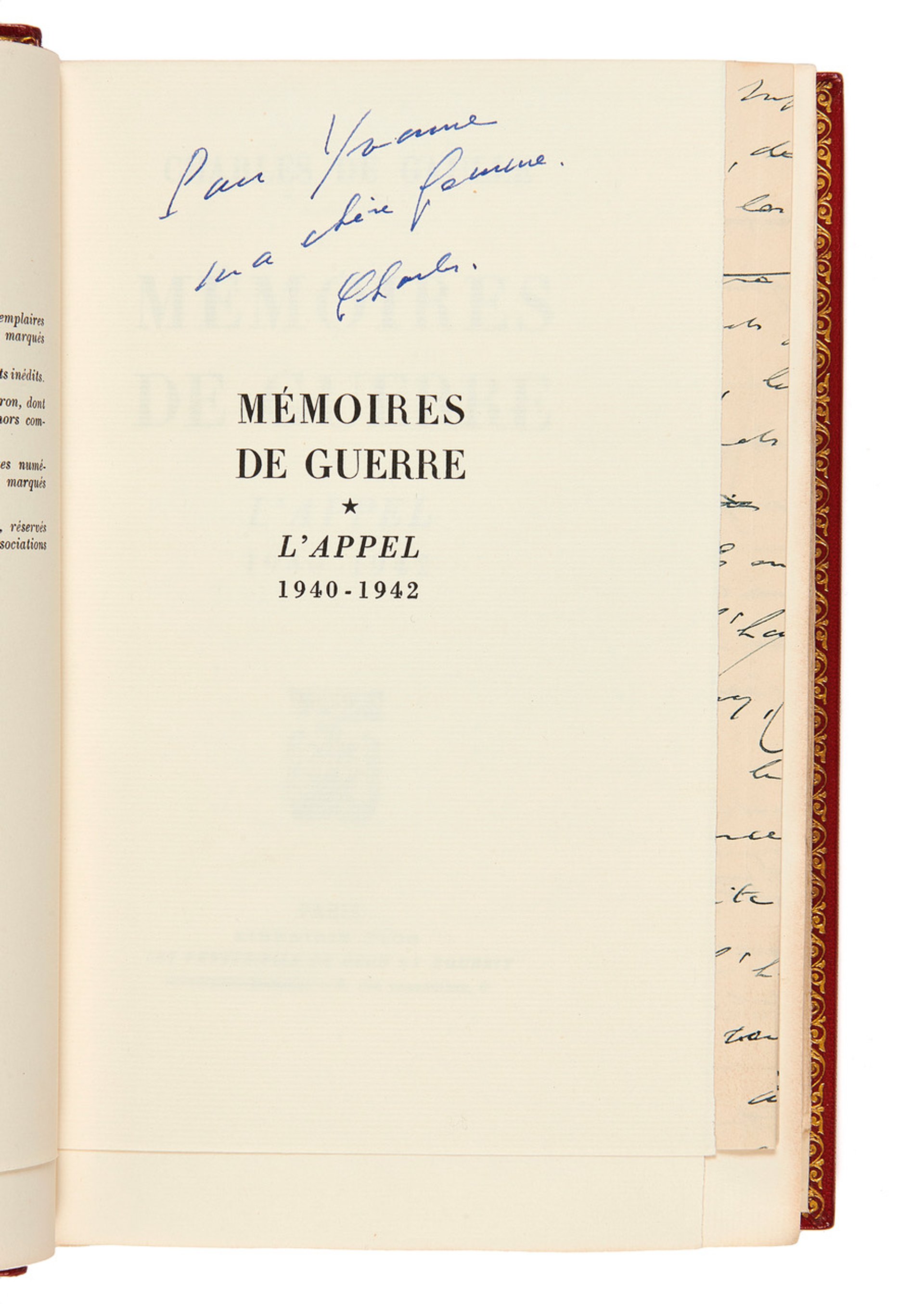 Charles de Gaulle, Mémoires de guerre, Paris, Librairie Plon, 1954-1959. Edition originale offerte à Yvonne de Gaulle. Courtesy Artcurial