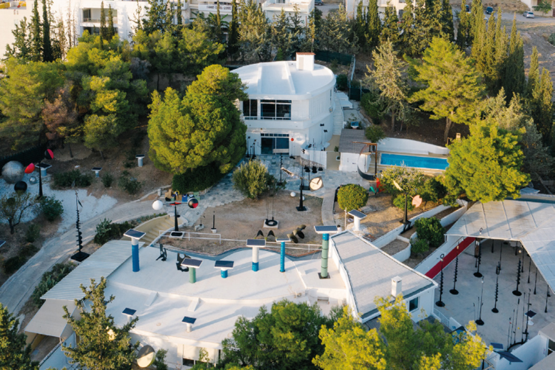 En regardant au loin depuis la colline de Gerovouno, on aperçoit à l’horizon, se détachant sur le ciel, le Parthénon dressé sur l’Acropole, symbole de cette Grèce antique et éternelle, de son apport politique et artistique au monde. C’est ici, au pied du mont Parnitha, sur un terrain situé à 175 mètres au-dessus de la mer – dominant ainsi le site historique de 19 mètres –, que Takis (1925-2019) a décidé d’installer ses résidences d’été et d’hiver, mais aussi un atelier et des locaux pour accueillir ses amis. Autrefois implanté dans la campagne proche de la capitale, le lieu s’insère dorénavant dans un banal quartier résidentiel bâti à flanc de colline.