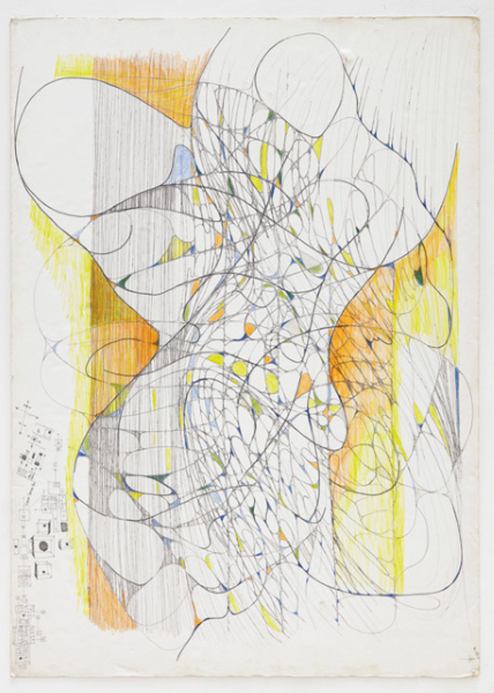 Réalisées sur de modestes cartons de 1 mètre par 1,40 mètre, et pour certaines simplement punaisées au mur, ses œuvres représentent des réseaux de lignes abstraites. D’une pointe fine, Keziah Jones entrelace des courbes, ébauches de toiles d’araignées, formant comme des synapses ou un système nerveux. En s’attardant sur ses motifs, l’œil distingue des contours organiques, des silhouettes féminines. Ensuite, l’artiste renforce certains traits afin de révéler les figures apparues inconsciemment.
