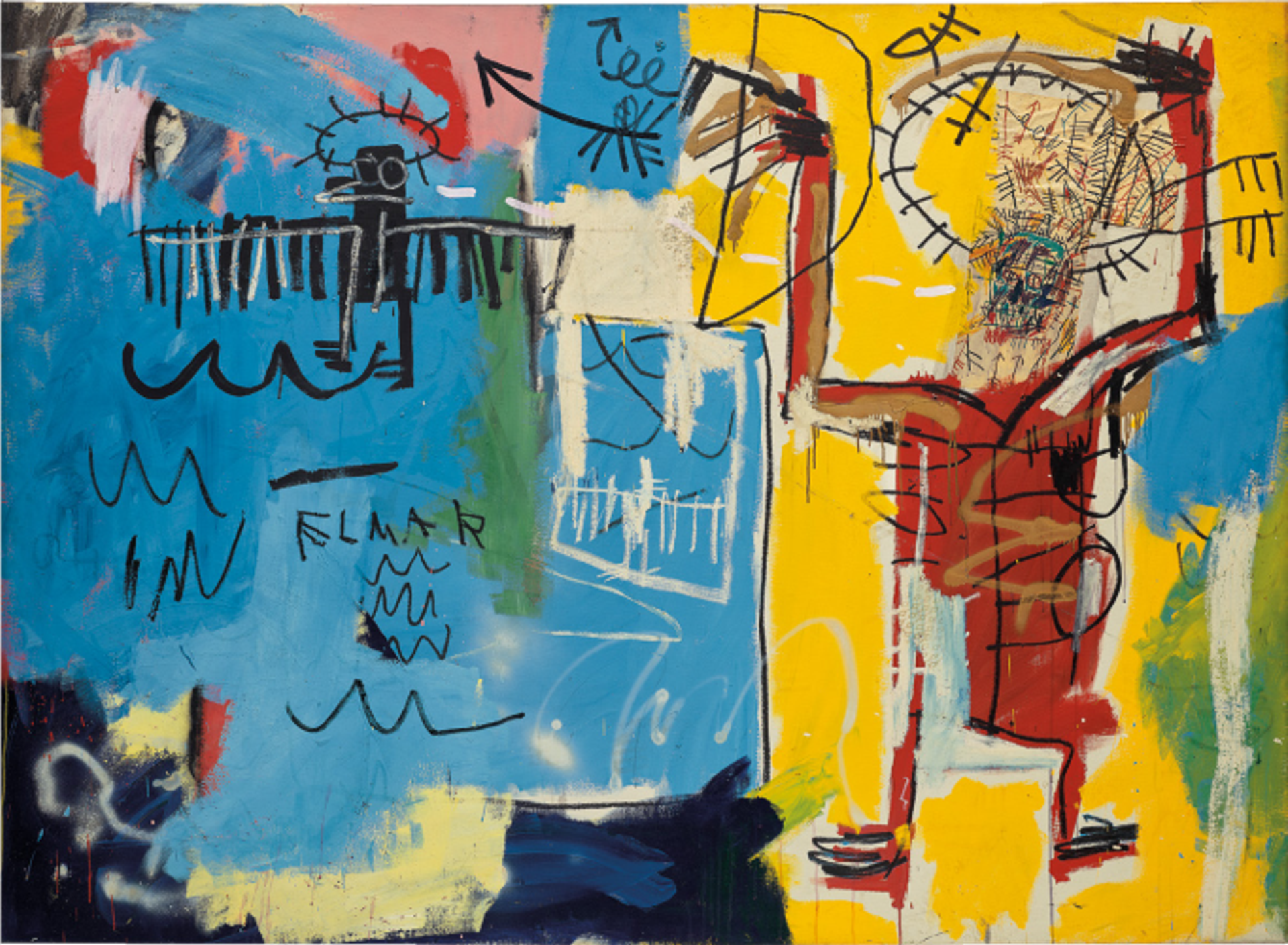 Jean-Michel Basquiat, Untitled (Elmar), 1982, acrylique, bâton d’huile, peinture en aérosol et collage Xerox sur toile. Vendu 46,5 millions de dollars chez Phillips le 14 mai 2024. © Phillips